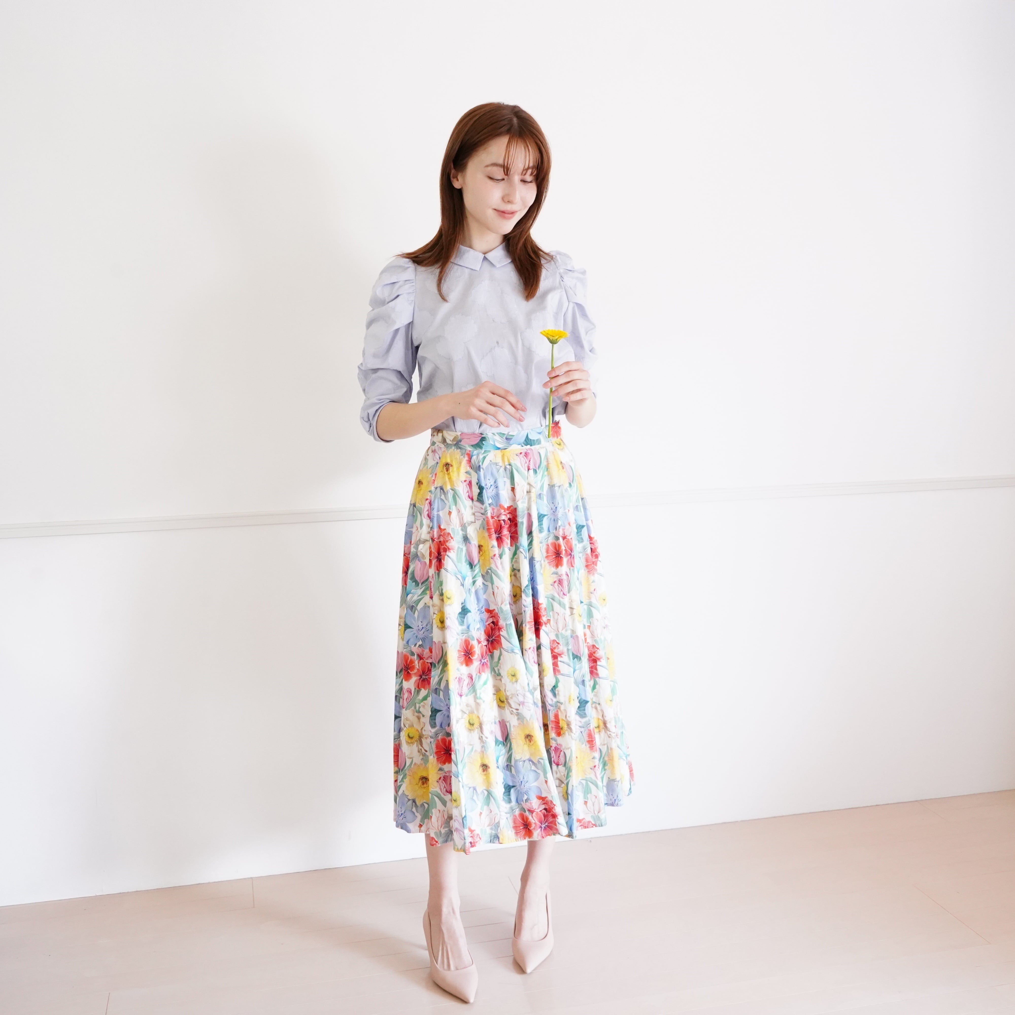 littlegenne カットジャカード襟付きくしゅくしゅ袖ブラウス(ブルー)38 41030 【デザイン】 無地ですが、地模様のあるカットジャカード素材を 贅沢に使用したくしゅくしゅ袖ブラウスです。 人気の襟付きデザイン。 くしゅくしゅ袖というよりはふわふわな雰囲気を持つ袖は 袖山にギャザーを寄せることで肩から袖口までふんわりと仕上げています。 さらに肩部分にはタックとギャザーを丁寧に施すことで さらにふんわりと肩を包むデザインになっています。 地模様はポンポンのようなお花の模様です。 小さな襟できちんとクラシカルな印象に。 シンプルでさわやかなデザインは、 春のおでかけや式典、お仕事やデートにもおすすめです。 【素材】 コットン100%のカットジャカード生地を使用しています。 カットジャカードとは、織り方の違いで柄を表現し、糸をカットすることで 奥行きが出て華やかさがございます。 無地部分にお花の柄を織り込んでいき、最後に、お花とお花の間の糸をカットする という手の込んだ技法でつくられています。 コットン100%の天然素材で、ロングシーズンお使いいただけます。 【スタイリング】 パンツにもスカートにも合わせていただきやすいデザインです。 アレンジの幅も広い1枚です。 サイズ:38(M) 寸法:肩幅30 身幅47 着丈57 袖丈41cm 素材:コットン100% 原産国:日本 model: 171cm Cut jacquard gathered sleeve blouse (blue) size:38(M) shoulder width30 body width47 body length57 sleeve length41cm 100% cotton made in Japan