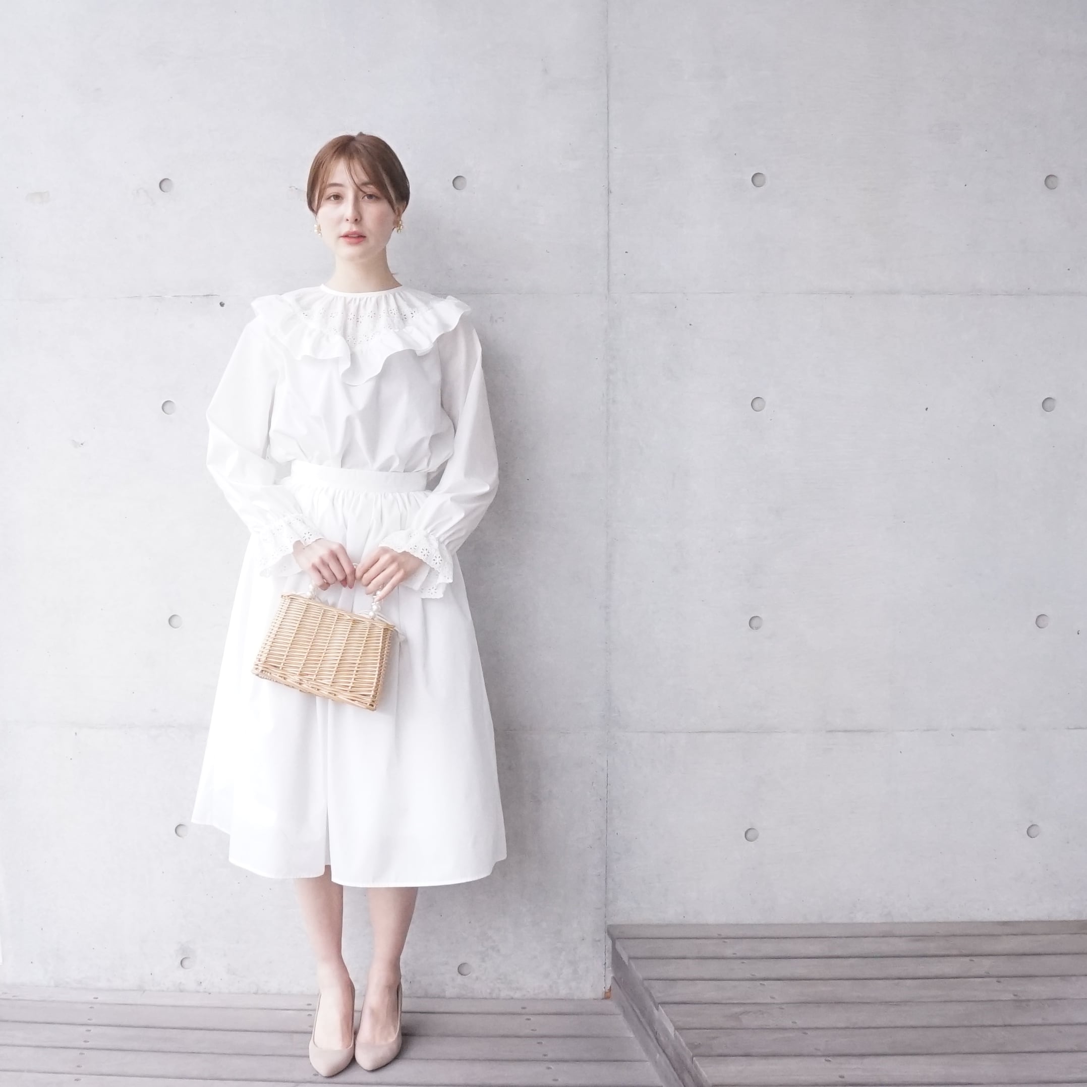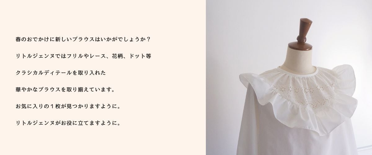 littlegenne レースとフリルのブラウス(オフホワイト)38 21030 【デザイン】 カットワークレースとたっぷりのフリルで春らしく華やかなデザインに。 白と黒シンプルなデザインとボリューム感のあるシルエットで活躍幅を広く。 胸元のギャザーで立体感を出しました。 袖は付けカフスのようなデザインにして、中にゴムを入れているので お好きな位置で留まります。 春はカーディガンやジャケット等の羽織を着ることも多いシーズンだと思いますので 重ねることもイメージしてデザインしました。 レースは前と袖口で重ねても見えるように、 フリルは肩までで、後ろ方向には付けずに上から羽織りやすく。 サイドスリット入りでスカートだけでなくパンツにも合わせやすくなっています。 【素材】 ポリエステルコットンブロードでしわになりづらく、きれいな印象で着れます。 レース部分は綿ローンに刺繍が入ったエンブロイダリーレースです。 【スタイリング】 卒業式や入学式、その他通勤やおでかけにもおすすめのきれいめデザインです。 オーバーサイズシルエットなのでカジュアルなパンツと合わせてもバランスが取りやすくなっています。 サイズ:38(M) 寸法:身幅57 着丈61 裄丈81cm 素材:ポリエステル65 コットン35% (切り替え部分)コットン100% 原産国:日本 ★合わせたデニムスカート→https://littlegenne.base.shop/items/97517533 ★セットアップスカート→https://littlegenne.base.shop/items/101025110 モデル身長171cm/156cm Lace and Frill Blouse (off white) size:38(M) body width57 body length61 ragran sleeve length81cm 65% polyester 35% cotton, (part) 100% cotton made in Japan