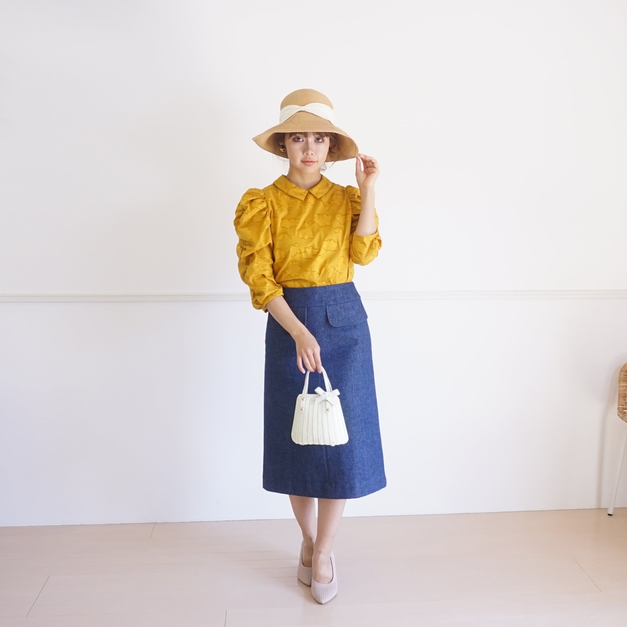 littlegenne フラワージャカード襟付きくしゅくしゅ袖ブラウス(イエロー)38 21010 【デザイン】 襟付きのくしゅくしゅ袖ブラウスです。 厚みのあるコットン100%の 華やかな花柄のカットジャカード生地を使用しています。 小さな襟できちんとした印象に。 春のおでかけやセレモニーへの出席シーン等にいかがでしょうか? ボリュームのある袖は肩や二の腕を華奢に見せてくれる効果もあります。 【素材】 コットン100%のカットジャカード生地を使用しています。 カットジャカードとは、織り方の違いで柄を表現し、糸をカットすることで さらに華やかさがプラスされた素材です。 コットン100%ならではのやわらかな風合いで、ロングシーズンお使いいただけます。 【スタイリング】 パンツにもスカートにも合わせていただきやすいデザインです。 襟付きできちんとした印象に。アレンジの幅も広い1枚です。 サイズ:38(M) 寸法:肩幅30 身幅47 着丈57 袖丈41cm 素材:コットン100% 原産国:日本 ★ギンガムチェックのスカート→https://littlegenne.base.shop/items/102460489 ★デニムのスカート→https://littlegenne.base.shop/items/97517533 model: 156cm Flower jacquard gathered sleeve blouse (yellow) size:38(M) shoulder width30 body width47 body length57 sleeve length41cm 100% cotton made in Japan
