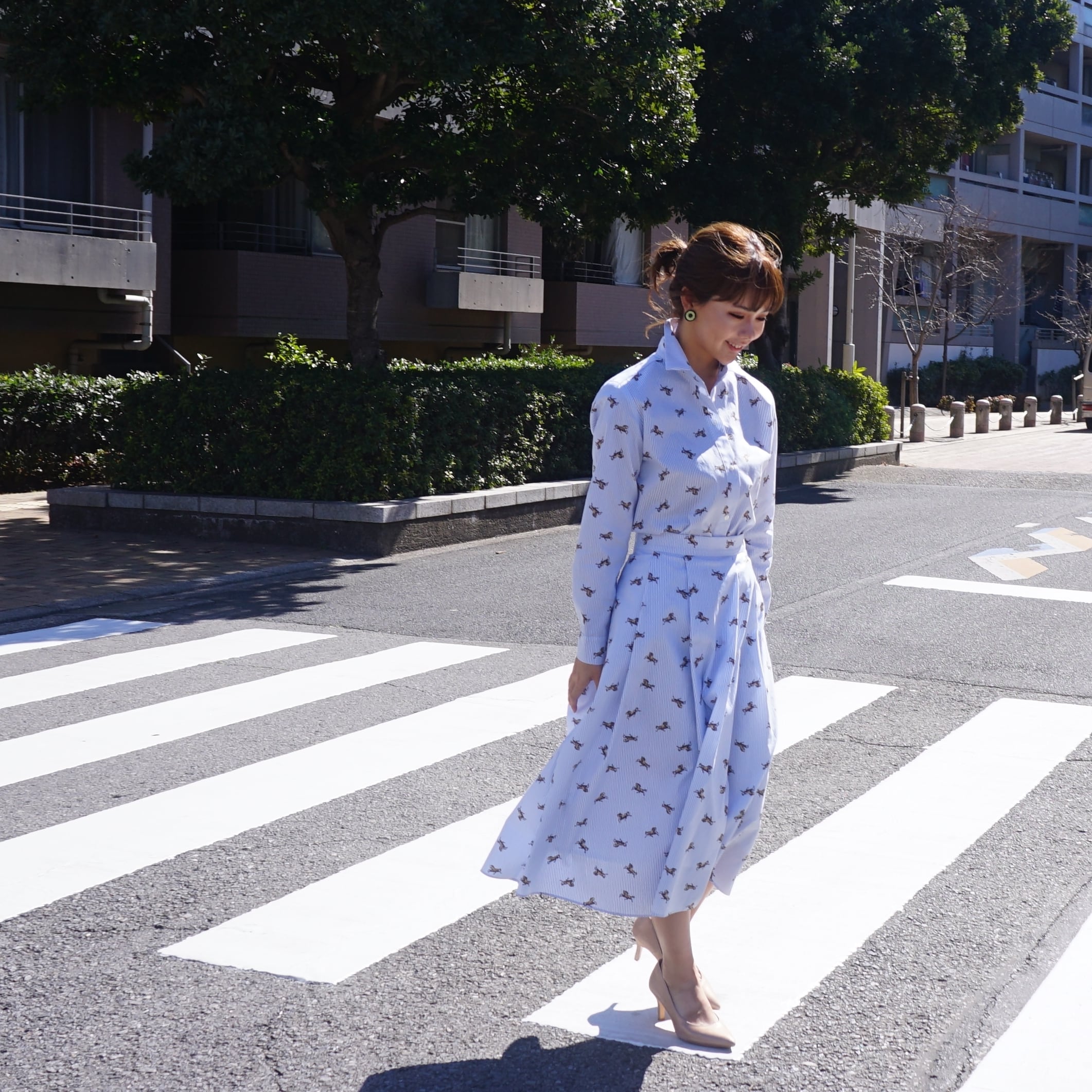 【オーダーは3/22まで】Stripe and Horse Tucked flare Skirt ストライプと馬のタックフレアスカート(ブルー)36,38