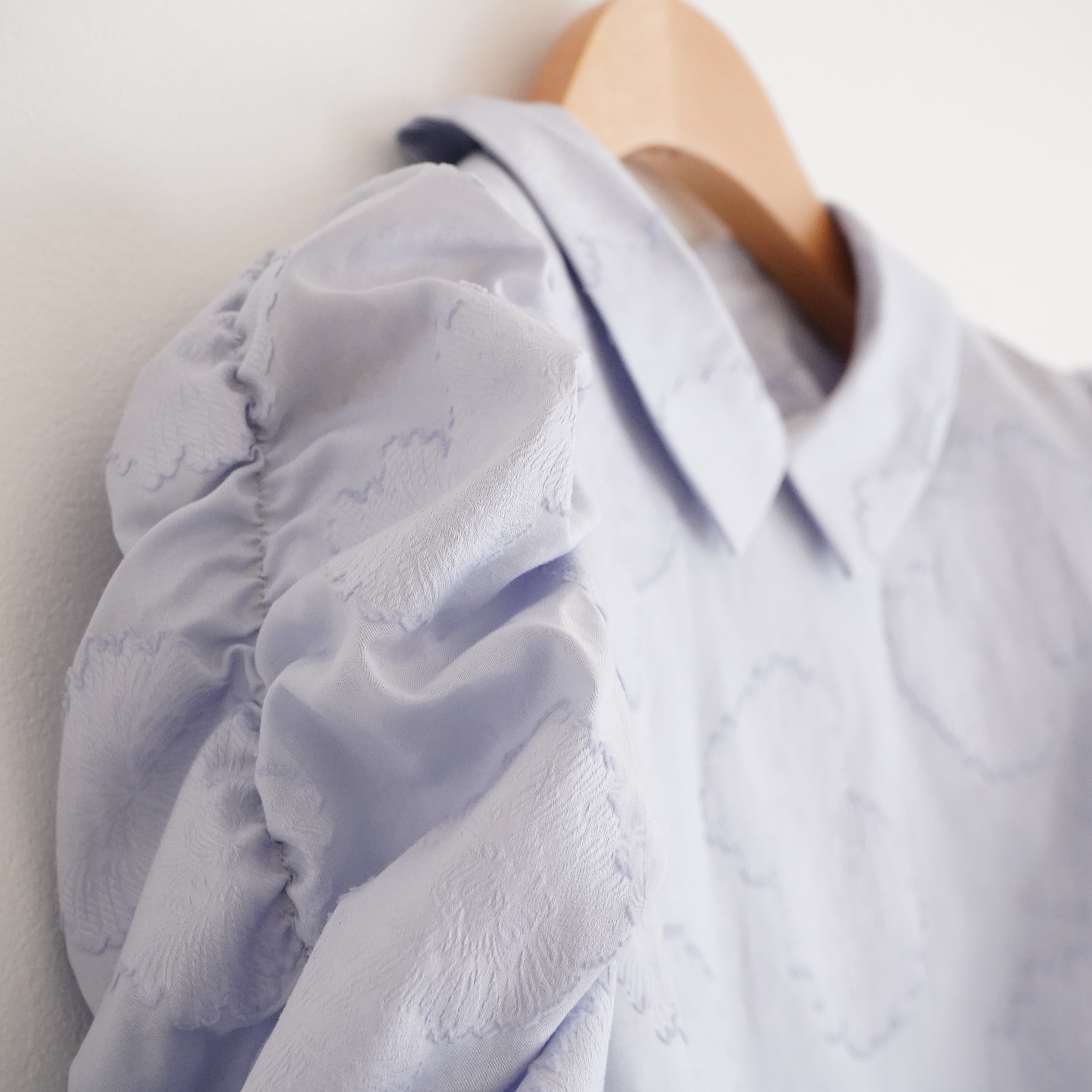 Cut jacquard gathered sleeve blouse カットジャカード襟付きくしゅくしゅ袖ブラウス(ブルー)38