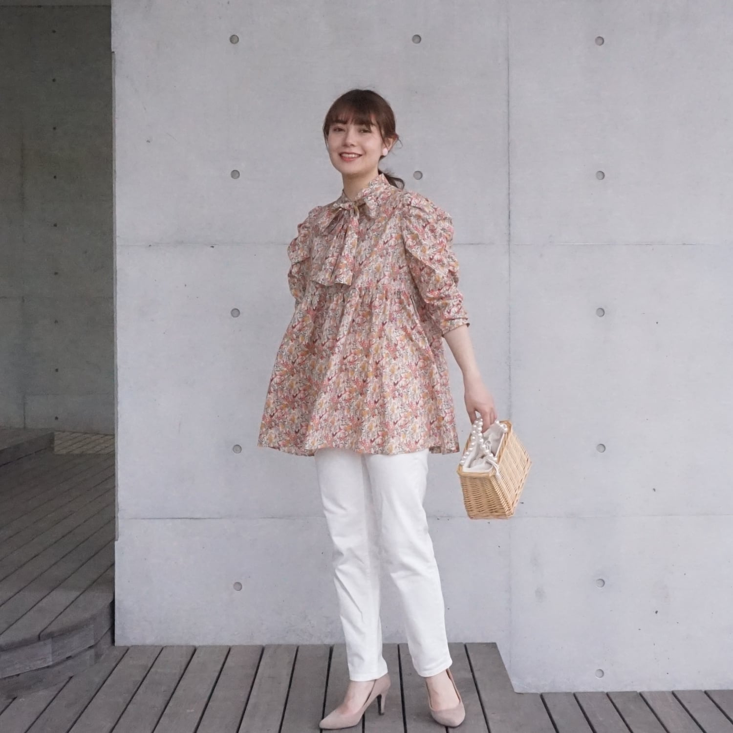 littlegenne くしゅくしゅ袖ボウタイチュニックブラウス(ピンク系)38 21020 【デザイン】 ワンピースのようにかわいらしく華やかながらも パンツを合わせられる安心感。 人気のくしゅくしゅ袖から 新作ボウタイ&ティアードのロング丈が華やかなチュニックブラウスです。 袖は袖山にギャザーを寄せてくしゅくしゅっとさせています。 華奢な方は肩にボリュームが出てうれしい、 二の腕が気になる方からは二の腕が隠れてうれしいとお声をいただいております。 ロングシーズン着られる七分袖です。 丈はお尻の隠れる丈で、ワンピースのような華やかさがあります。 襟元の大きめリボンでお顔回りも華やかに。 カーディガンやジャケットのインナーにもおすすめです。 【素材】 日本製の綿ローン生地(リバティタナローンと同じ種類の生地)を使用しています。 しなやかで滑らかな上質上品なコットン素材です。 薄手で軽いので、胸下からの切り替えがふんわりと風に揺れます。 柄は大人っぽい、一見するとお花っぽくない花柄です。 【スタイリング】 細身のパンツ、太めパンツ、デニム…パンツ合わせがおすすめです。 さっと着て、スタイルが完成するので、ワンピース並みに便利な1枚です。 合わせたセンタープレスの細身パンツもおすすめです。 サイズ:38(M) 寸法:肩幅30 身幅46 着丈73 袖丈41cm 素材:コットン100% 原産国:日本 ★合わせた美脚パンツはこちら→https://littlegenne.base.shop/items/67939603 モデル身長: 163cm / 160cm Gathered sleeve bow dress blouse (black) size:38(M) shoulder width30 body width46 body length sleeve73 length41cm 100% cotton made in Japan