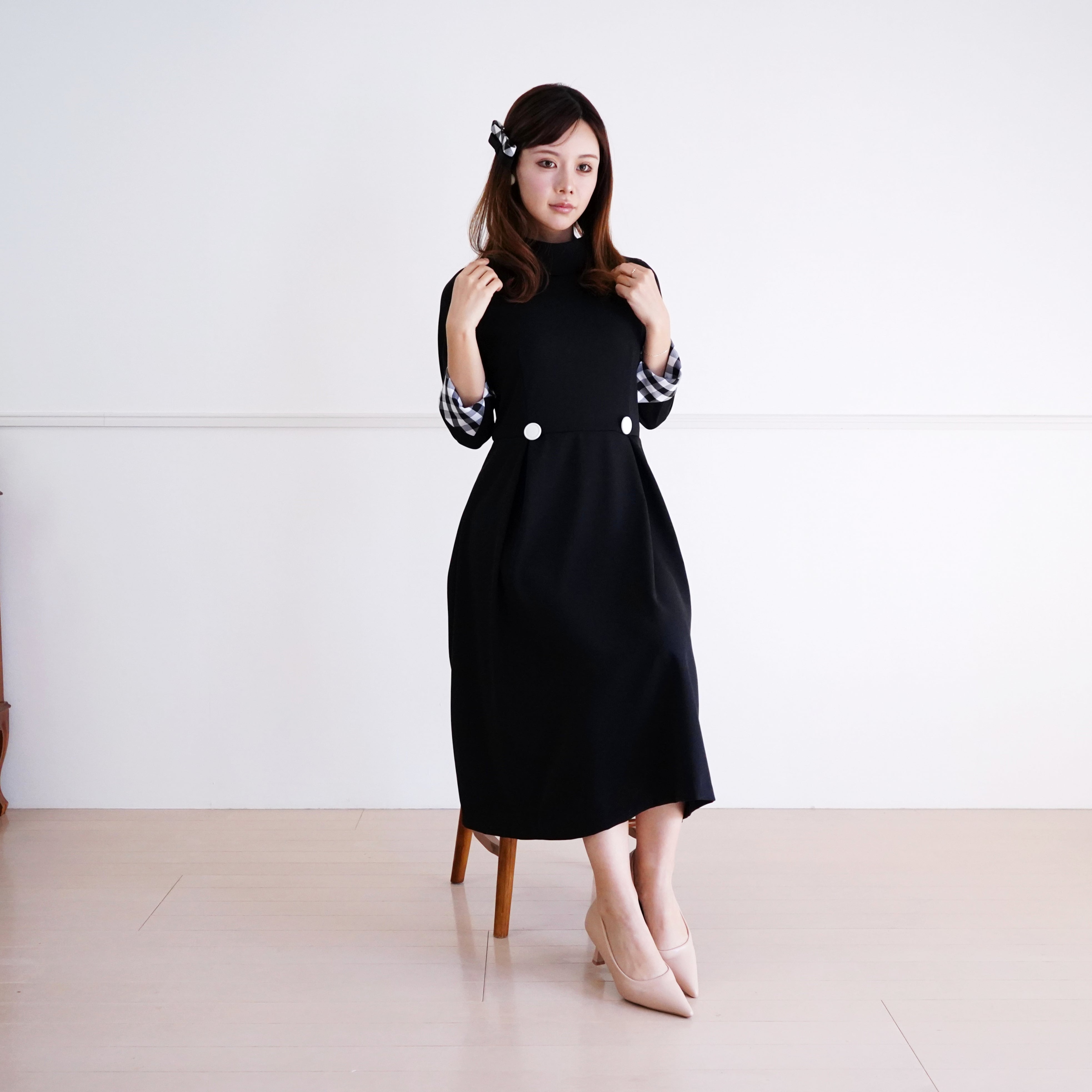 littlegenne ロールペタルカラーブラウス(ブラック)38 41021 【デザイン】 ロールカラーから着想した、 ロールカラーと花びらのような襟のブラウスです。 襟の後ろはリボンに。 そではスリットが入っているので、折り返して着れます。 【素材】 ポリエステル綿混紡のブロード素材です。 手洗い可能で、ノンアイロンでも着れます。 【スタイリング】 スカートともパンツとも合わせやすい丈です。 ワンツーコーデでかわいく見えるデザインを考えました。 袖は折り返しても、伸ばしてもOKです。 お揃いのギャザースカートもございます。 サイズ:38(M) 寸法:肩幅37 身幅48 着丈50 袖丈50cm (折り返した状態で約43cm) 素材:ポリエステル65 コットン35% 原産国:日本製 モデル身長156㎝ Roll and petal collar Blouse (black) size: M shoulder width 37, body width 48, body length 50, sleeve length 50cm 65% polyester, 35% cotton made in Japan
