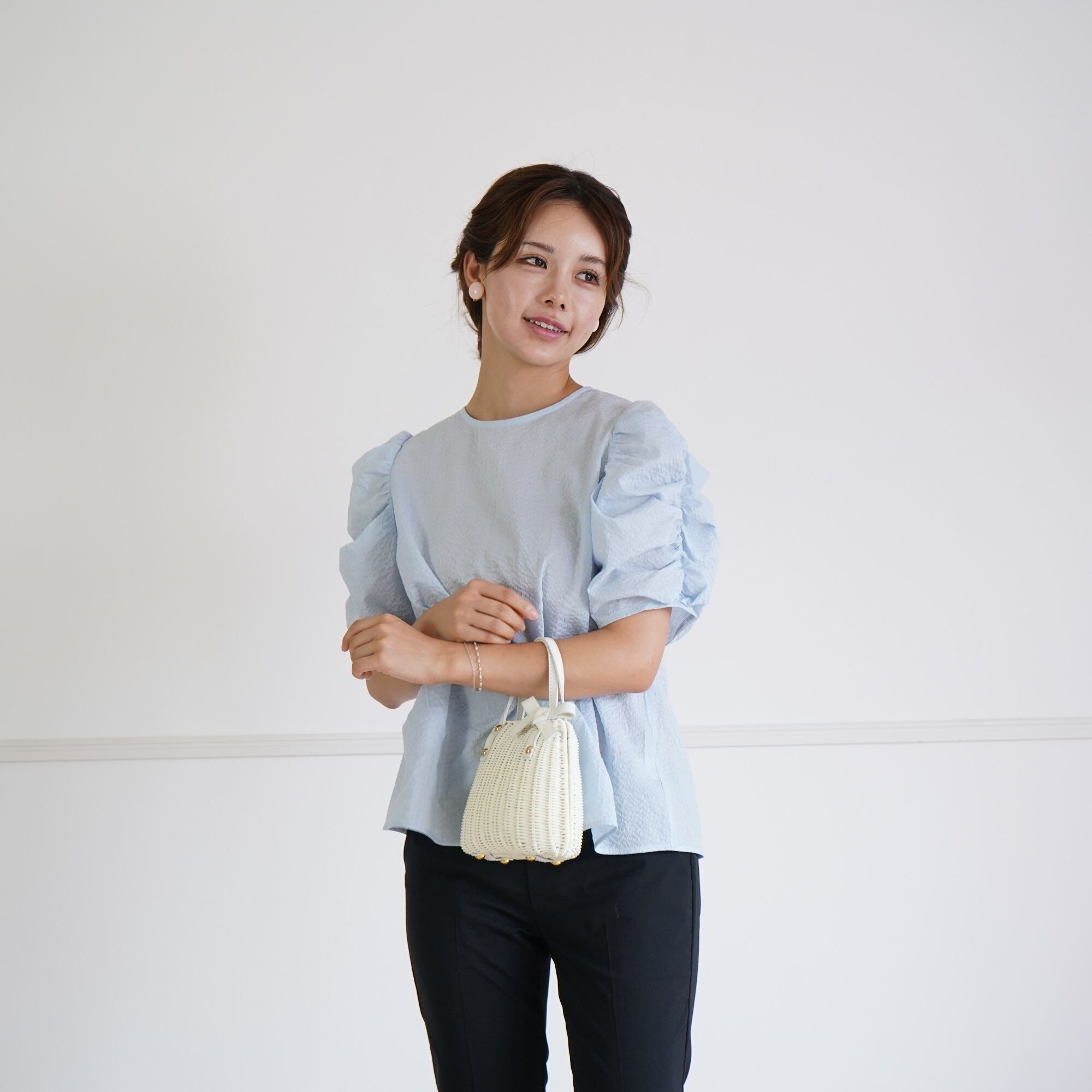 ボリュームのあるパフ袖にくしゅくしゅとシャーリングを入れたデザインのブラウスです。
