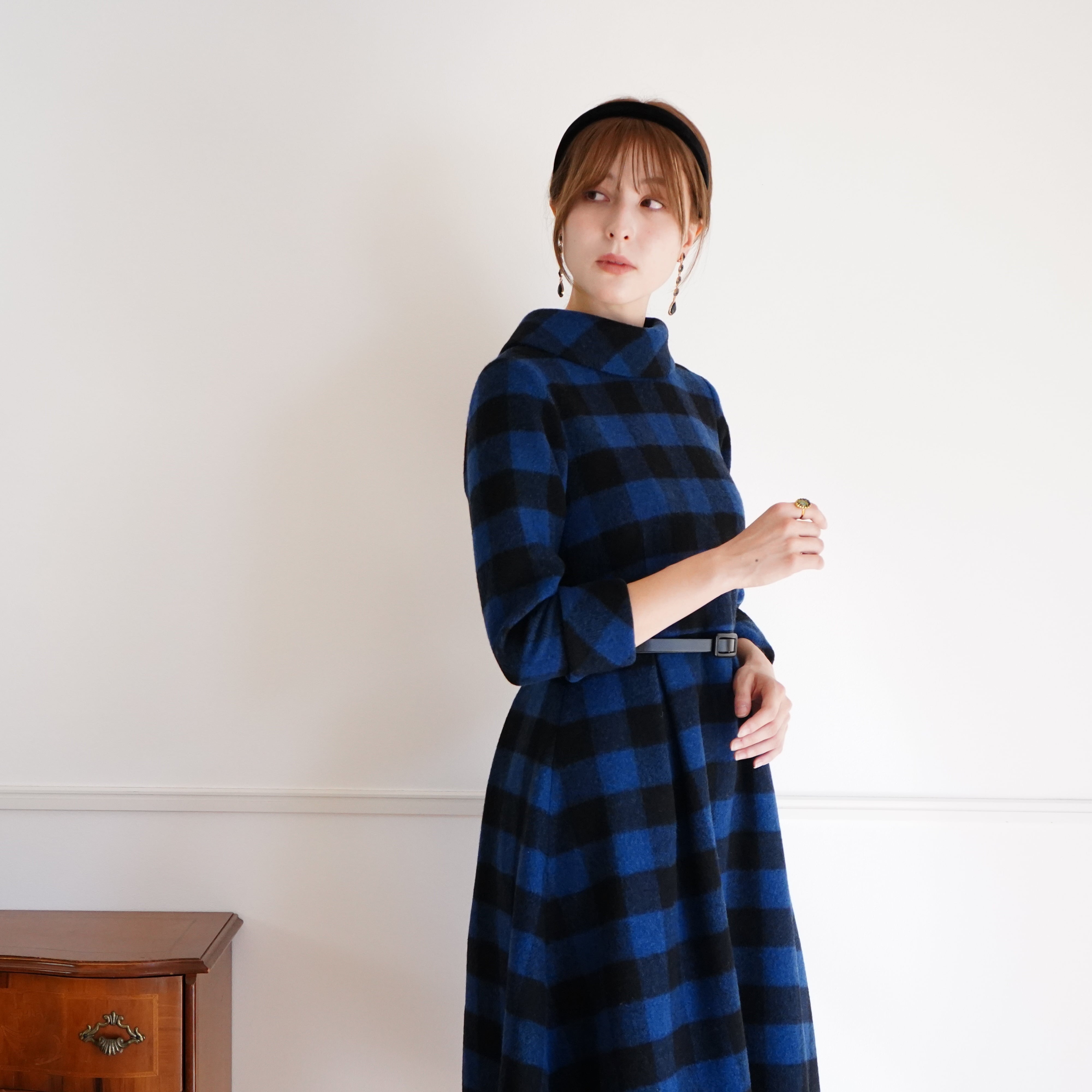 Winter check roll collar dress 冬のチェックロールカラーワンピース(ブルー)36, 38