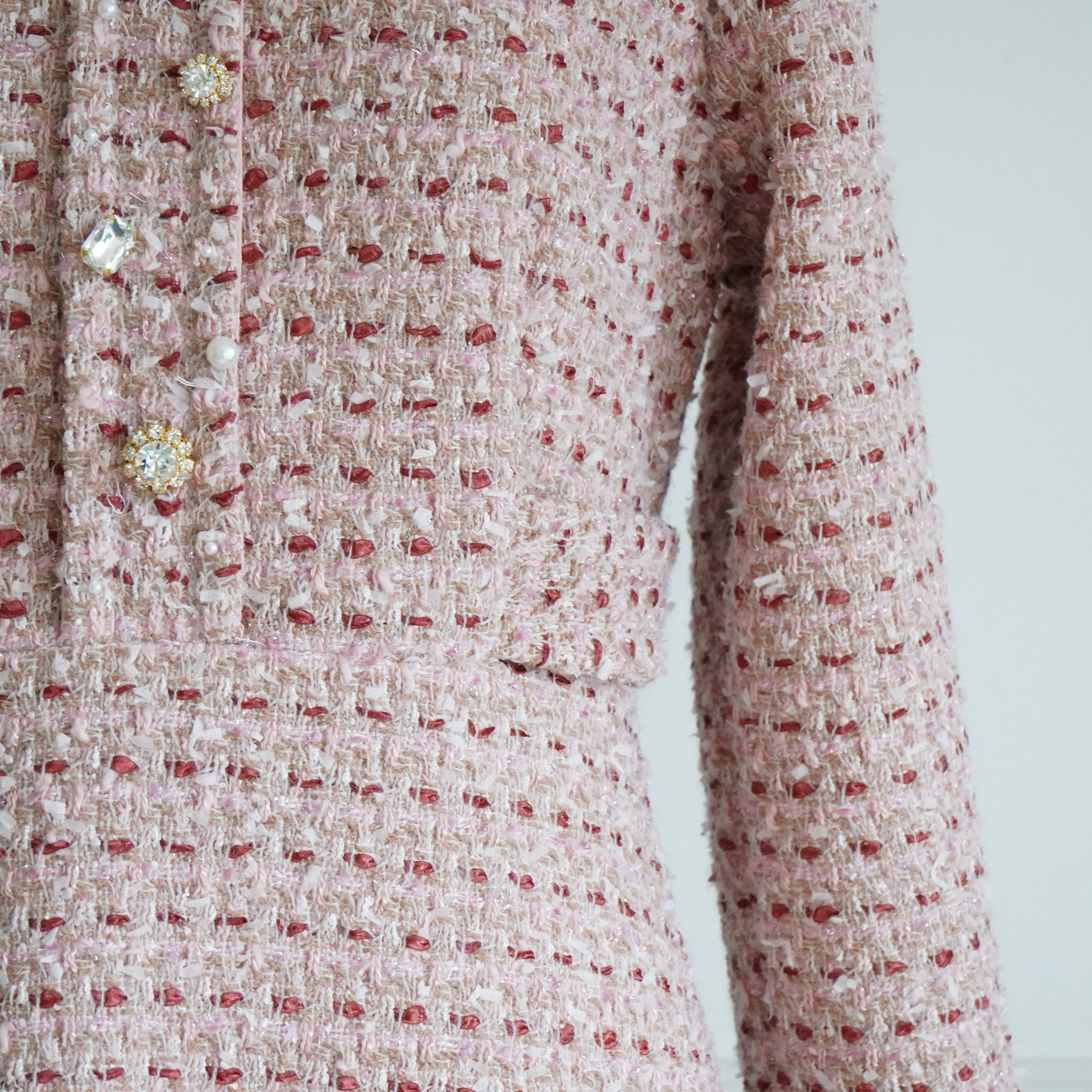 合わせるアイテムはツイードの中から色を取ってボルドーやピンク、ベージュ、オフホワイトも合いますし、