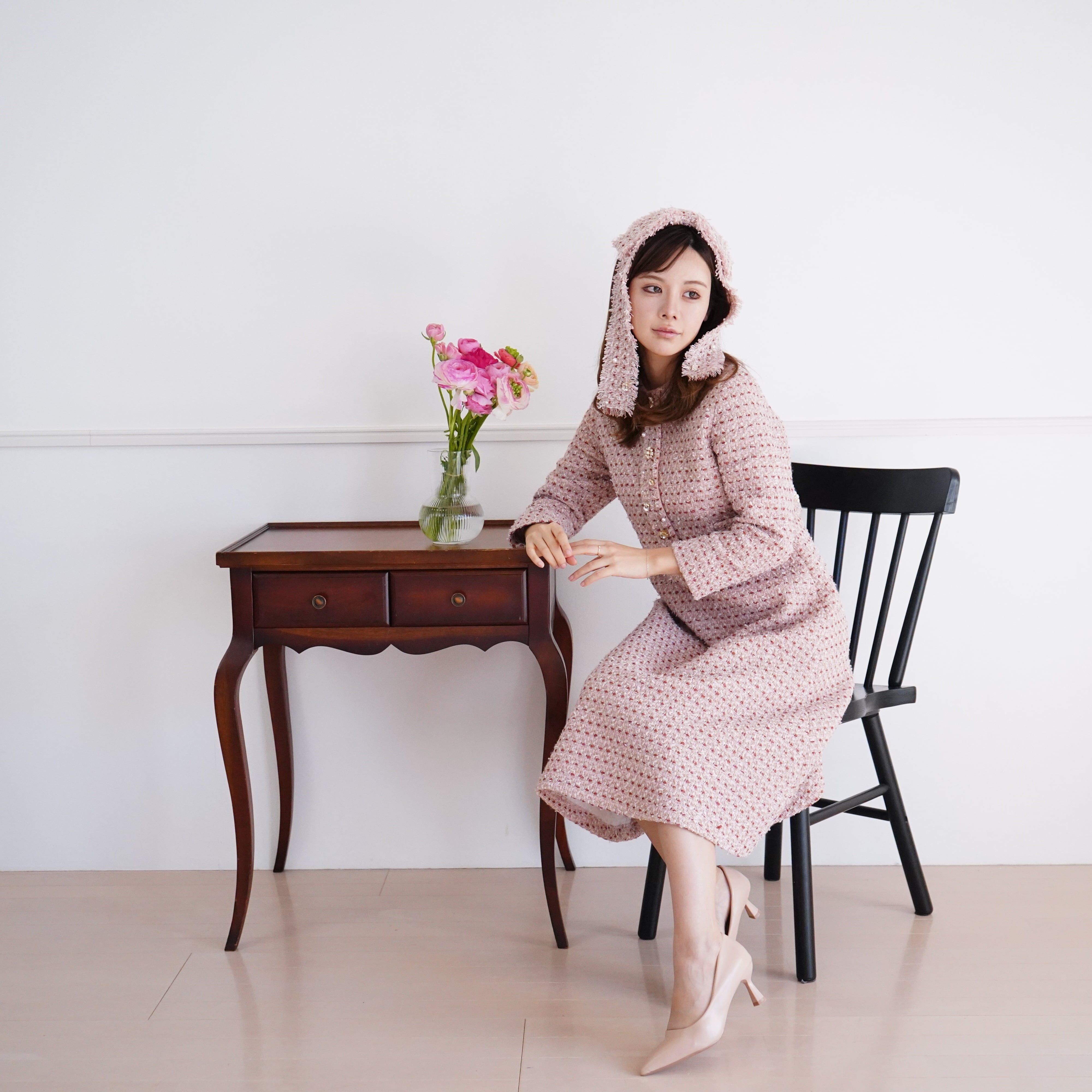 ツイードのワンピース、ブラウスとお揃いのツイードを使用しています。