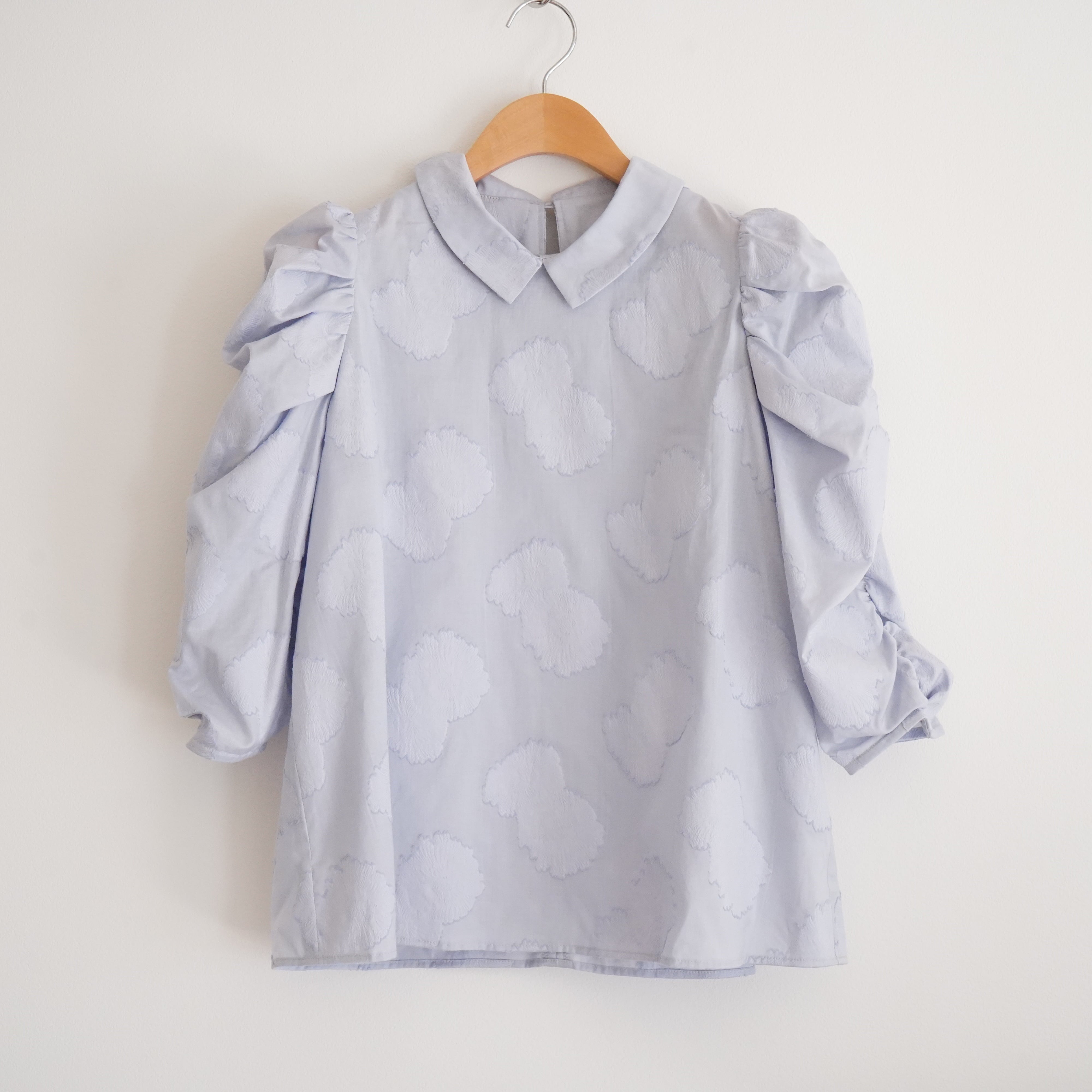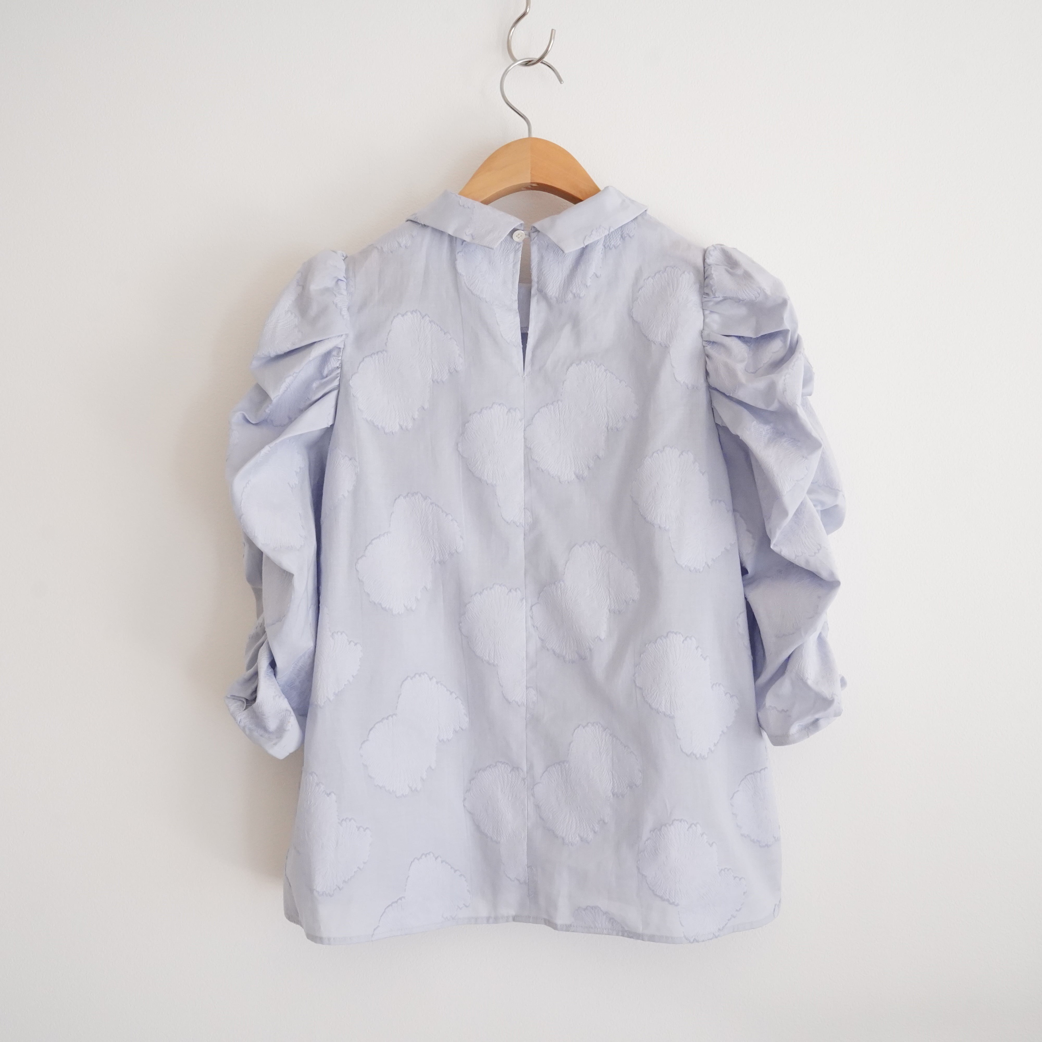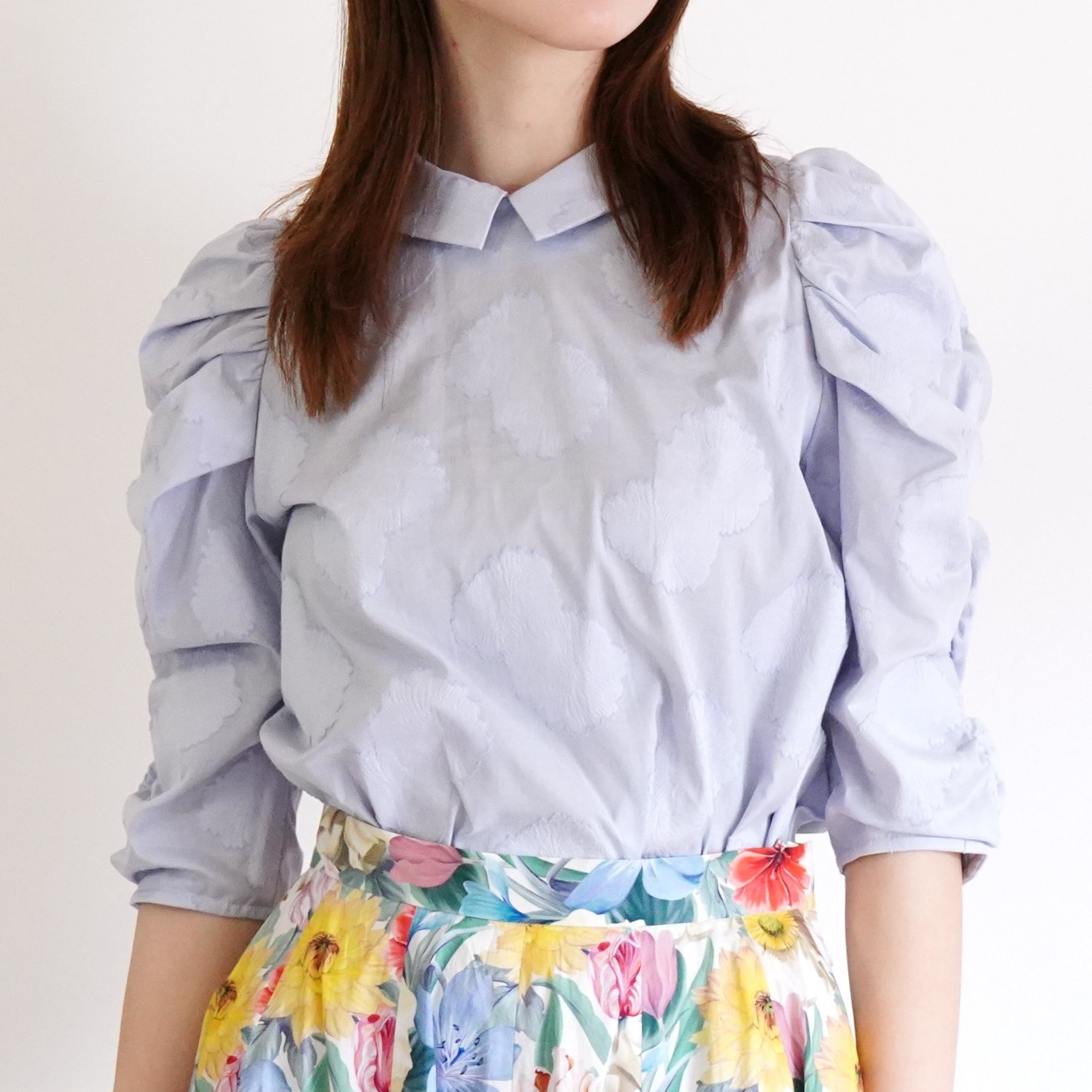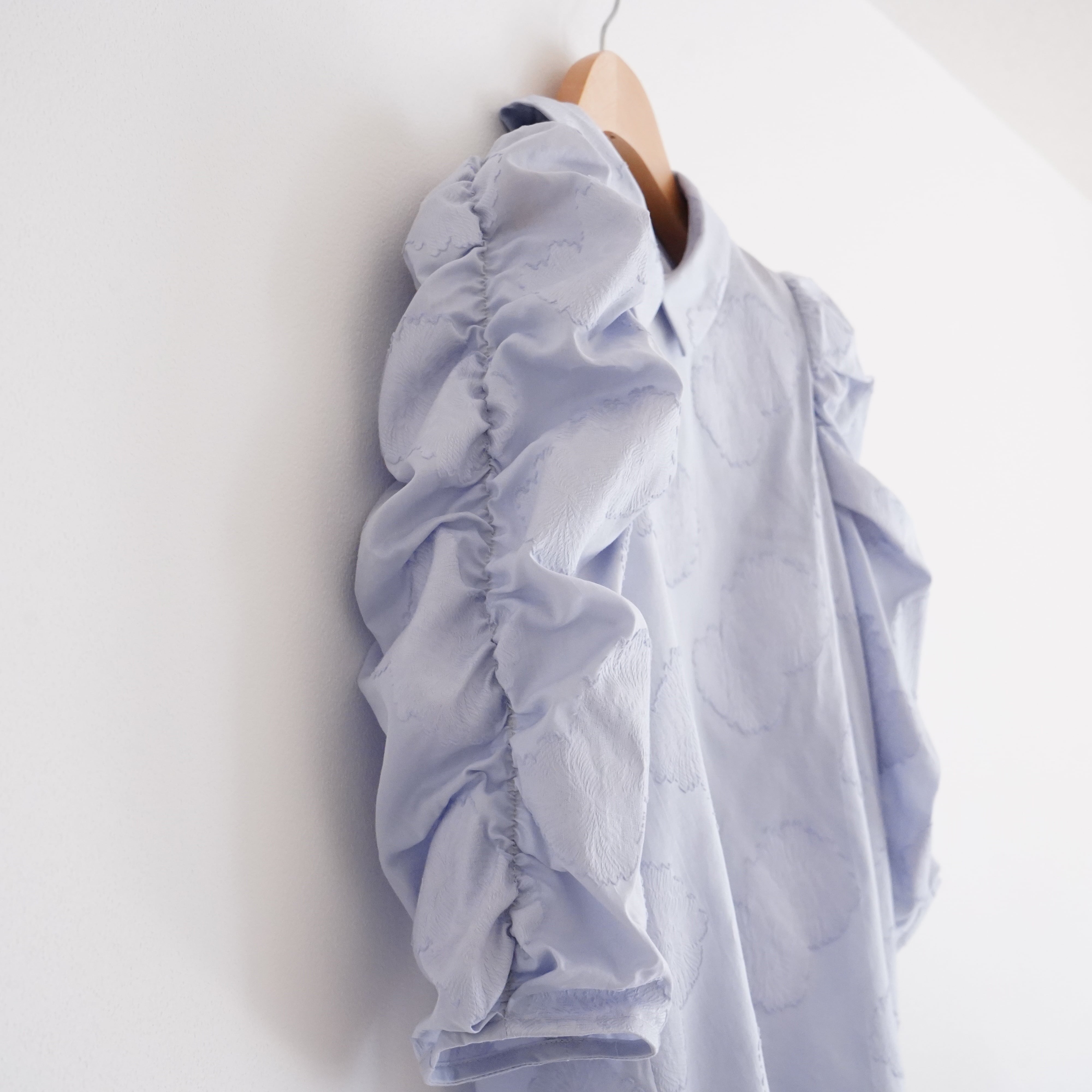 Cut jacquard gathered sleeve blouse カットジャカード襟付きくしゅくしゅ袖ブラウス(ブルー)38