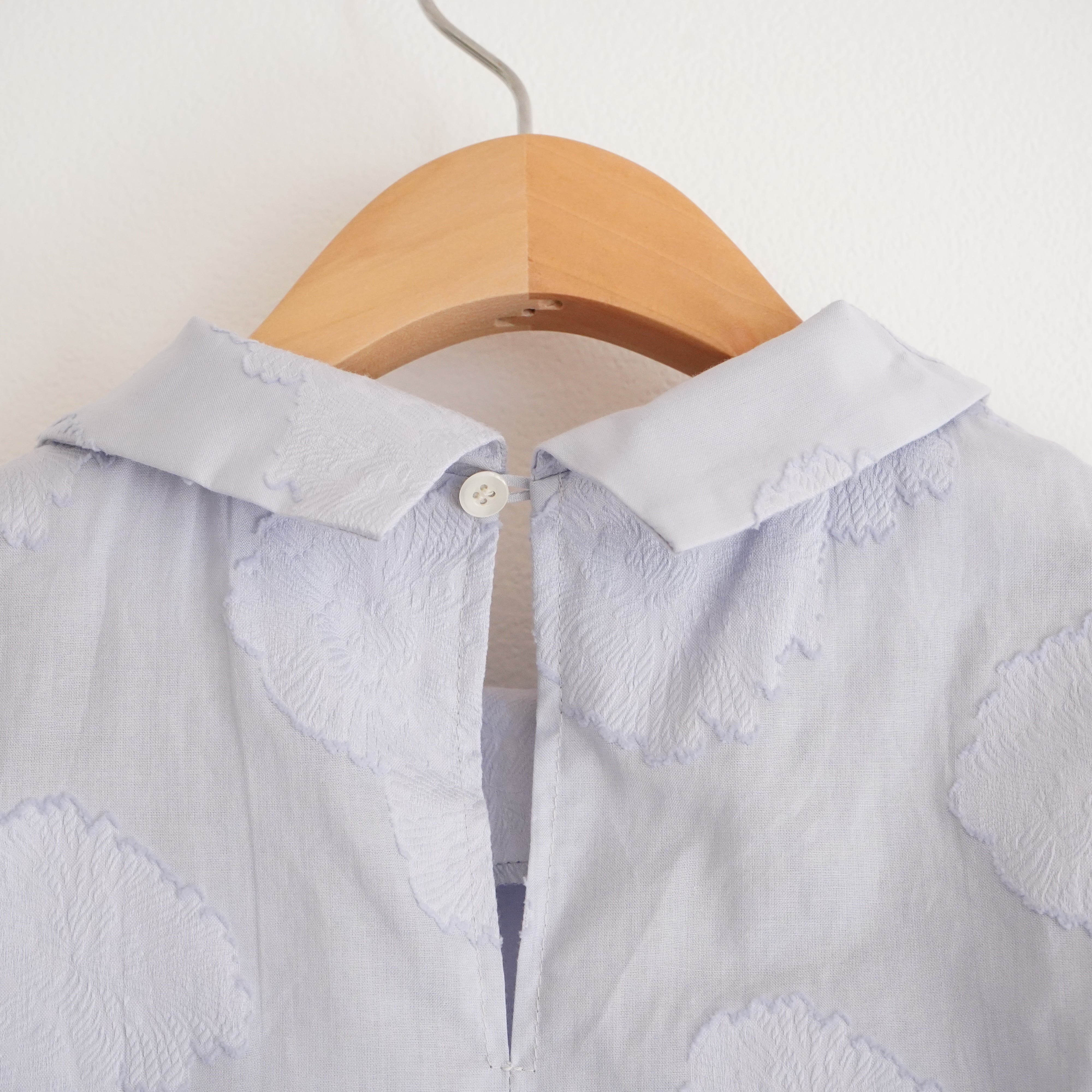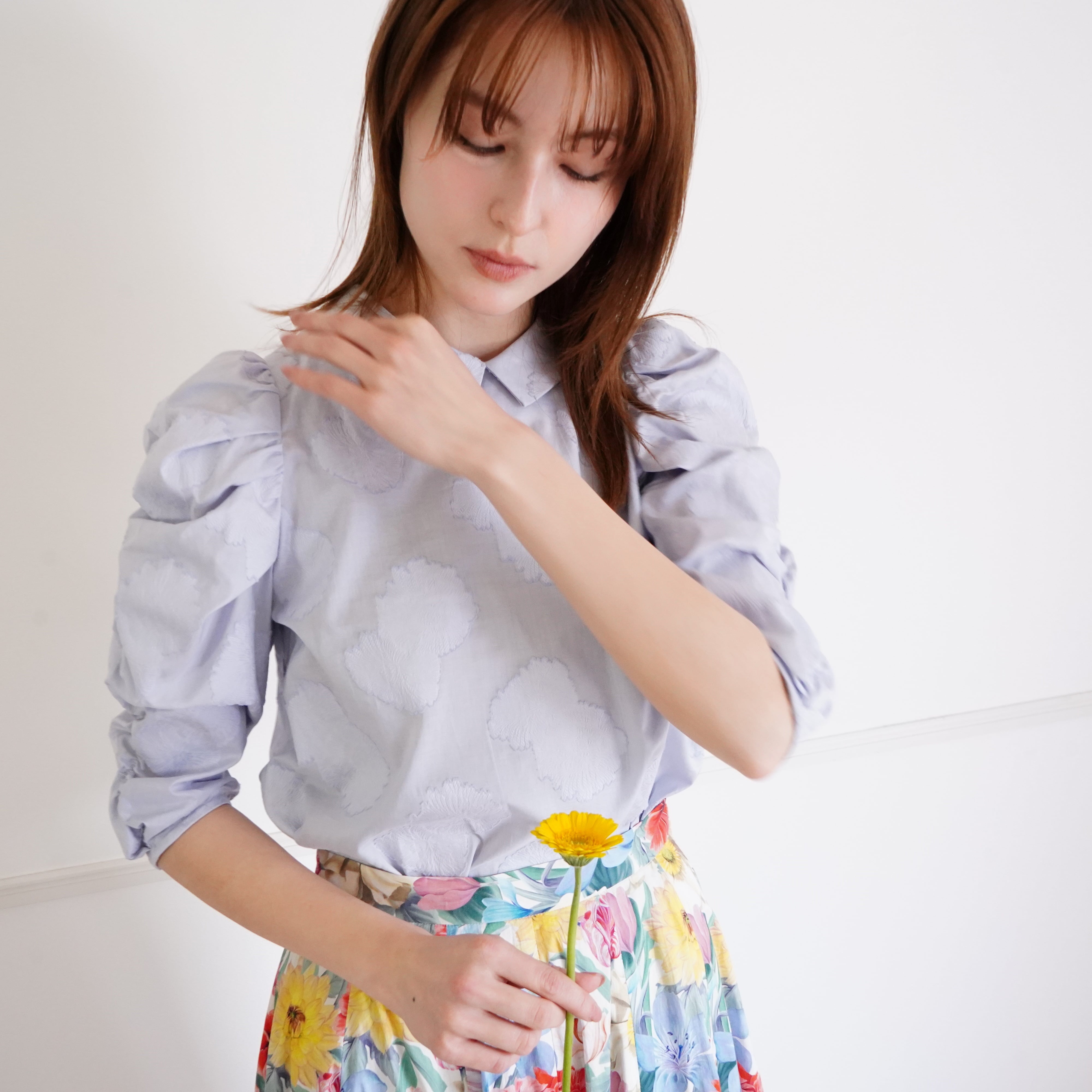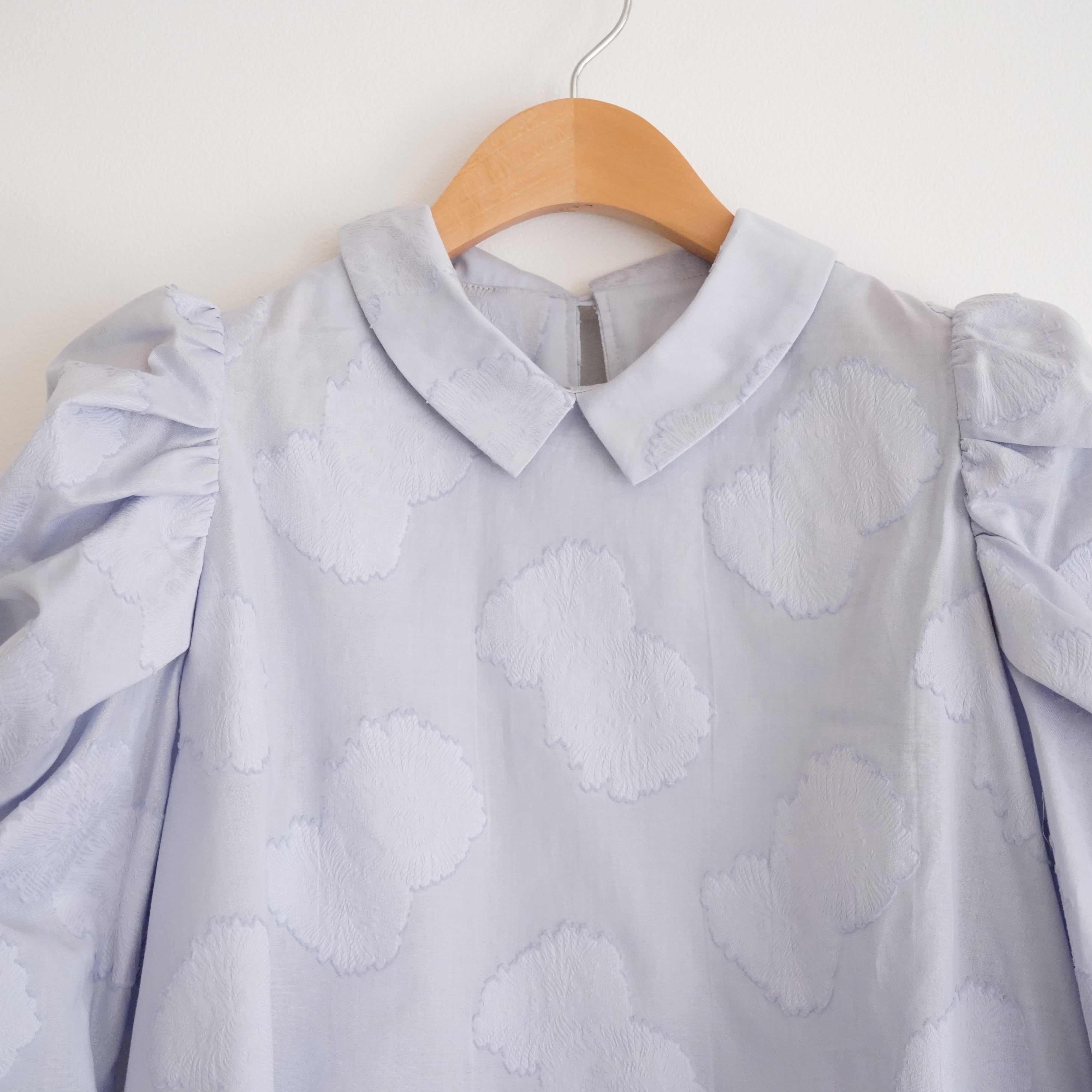 Cut jacquard gathered sleeve blouse カットジャカード襟付きくしゅくしゅ袖ブラウス(ブルー)38