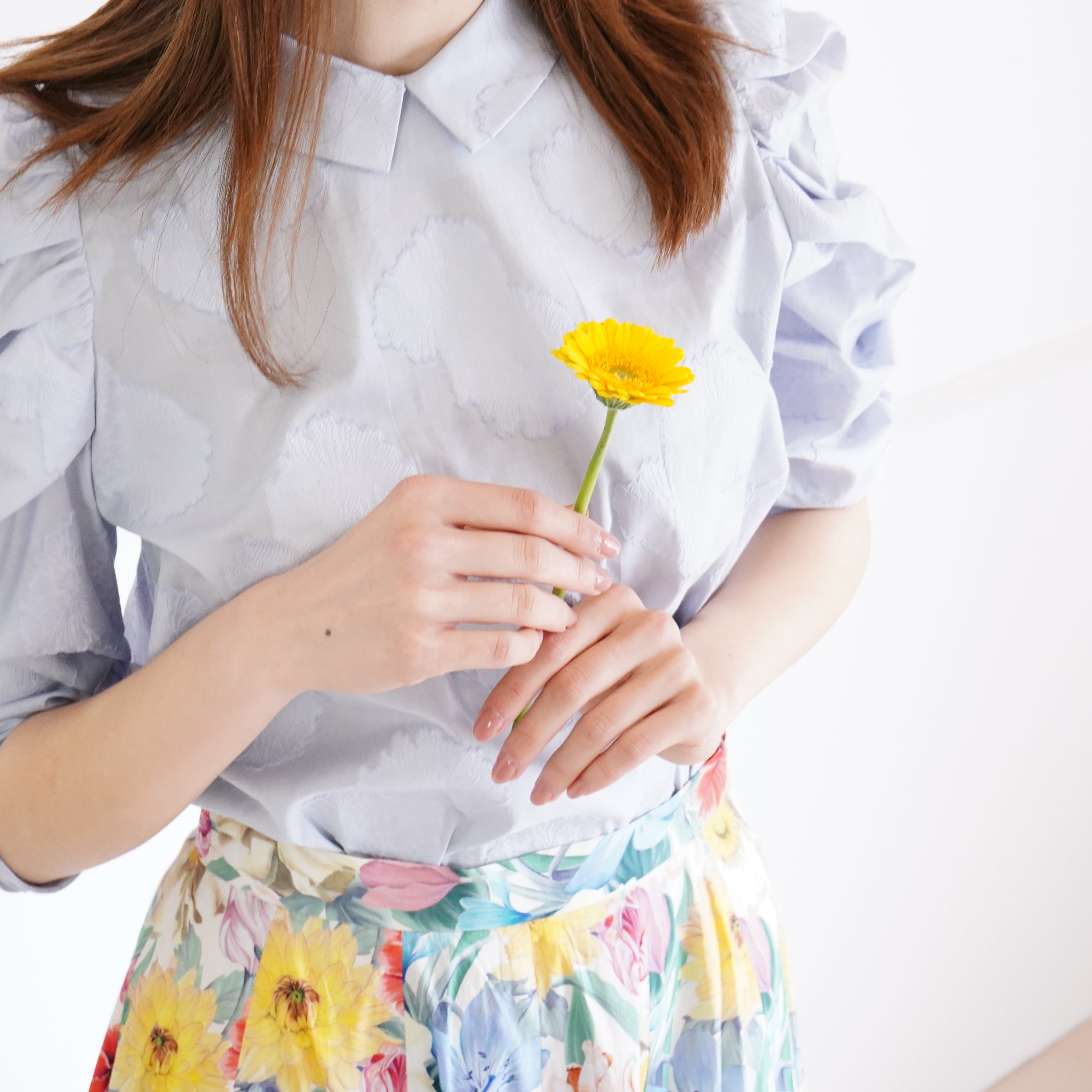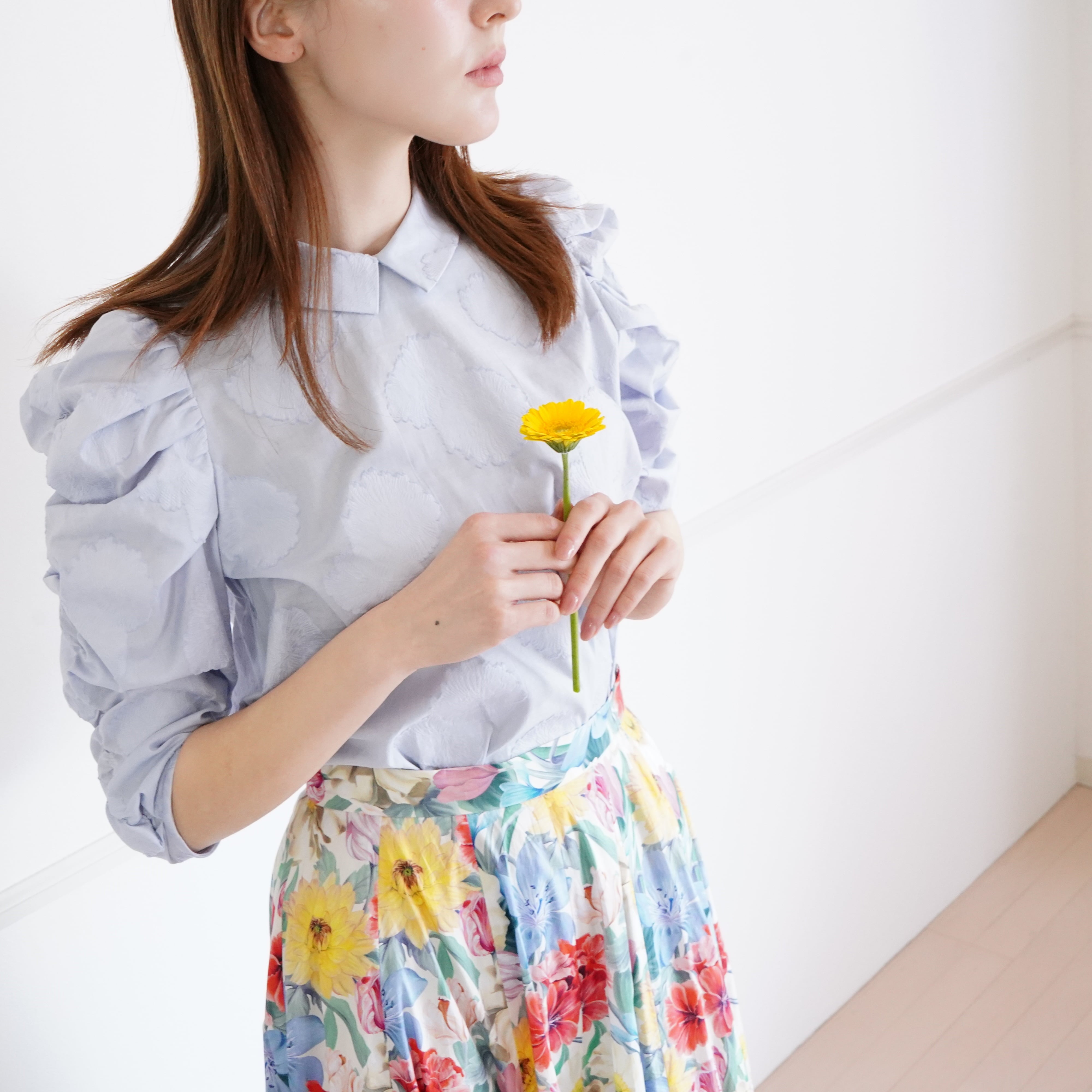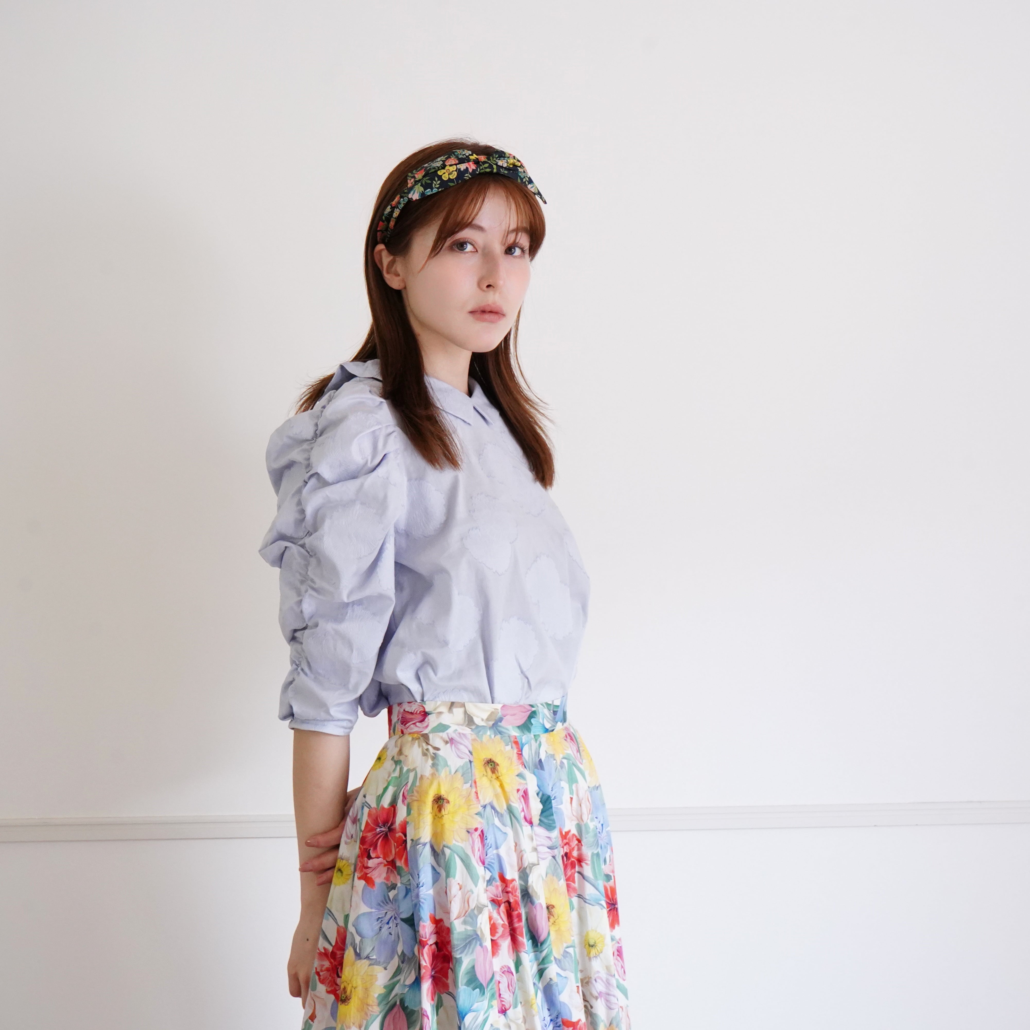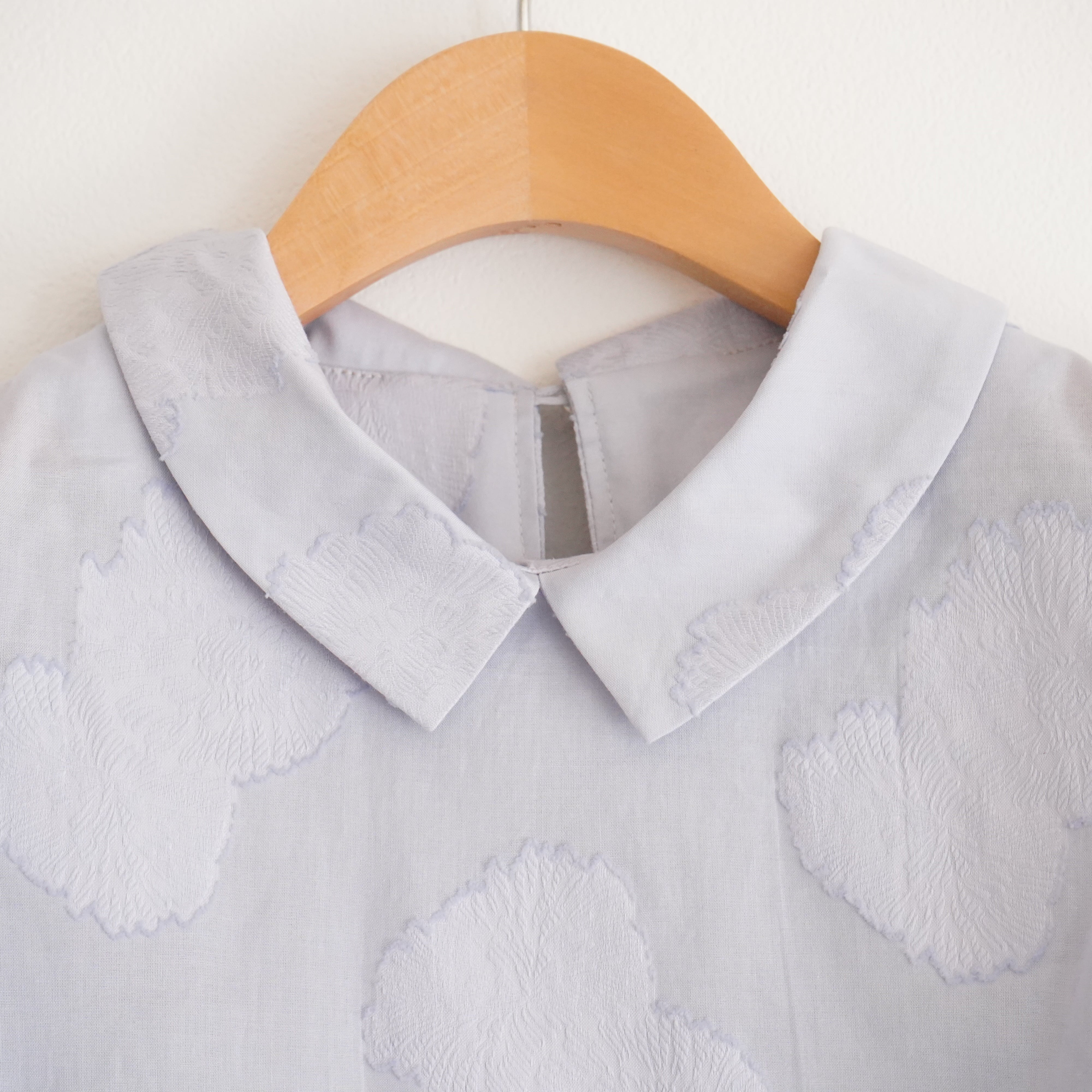 Cut jacquard gathered sleeve blouse カットジャカード襟付きくしゅくしゅ袖ブラウス(ブルー)38