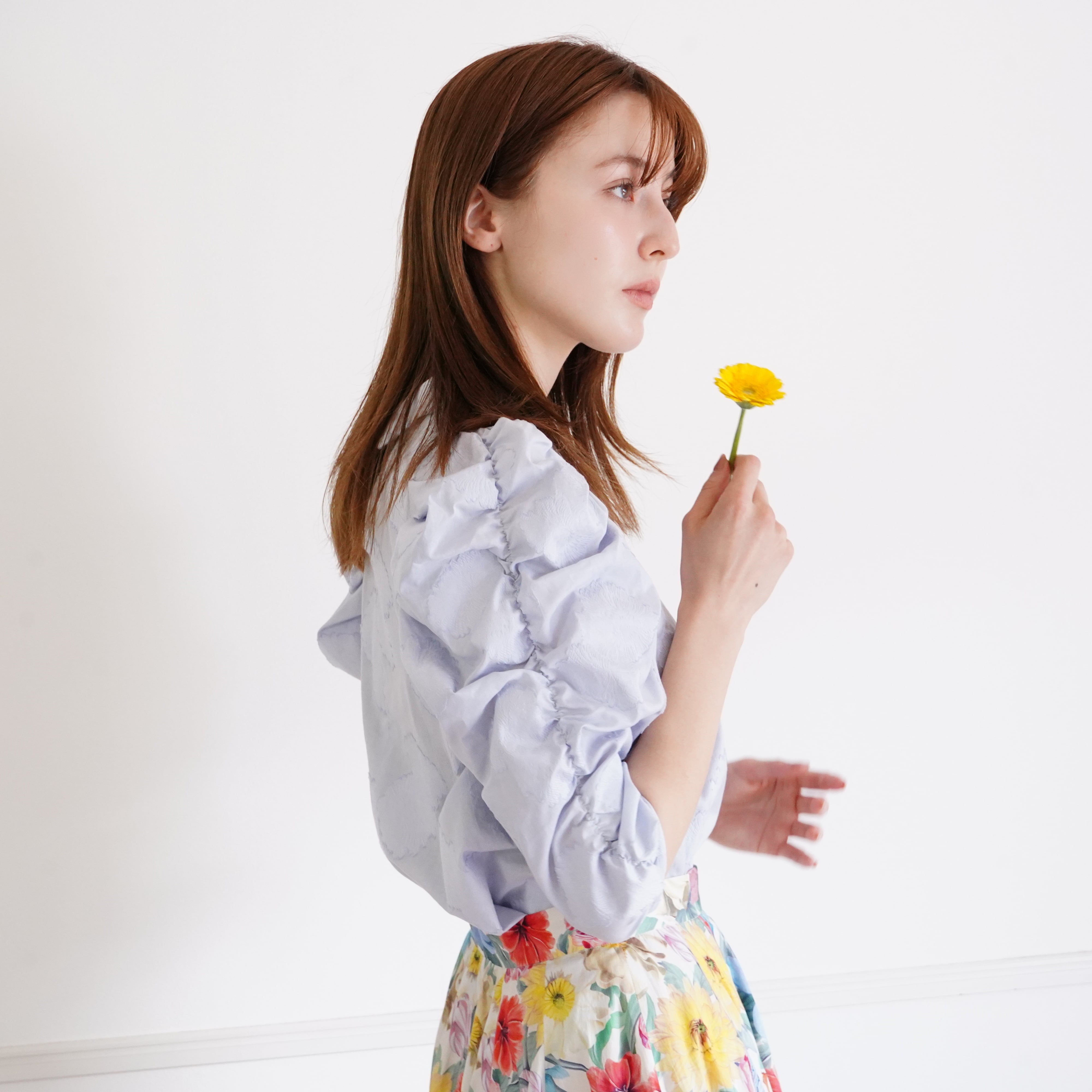 Cut jacquard gathered sleeve blouse (blue)