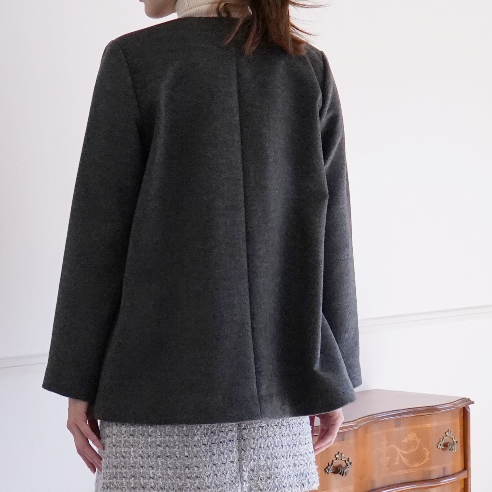 ショート丈のシンプルなコートながら、フレアシルエットにしたことで