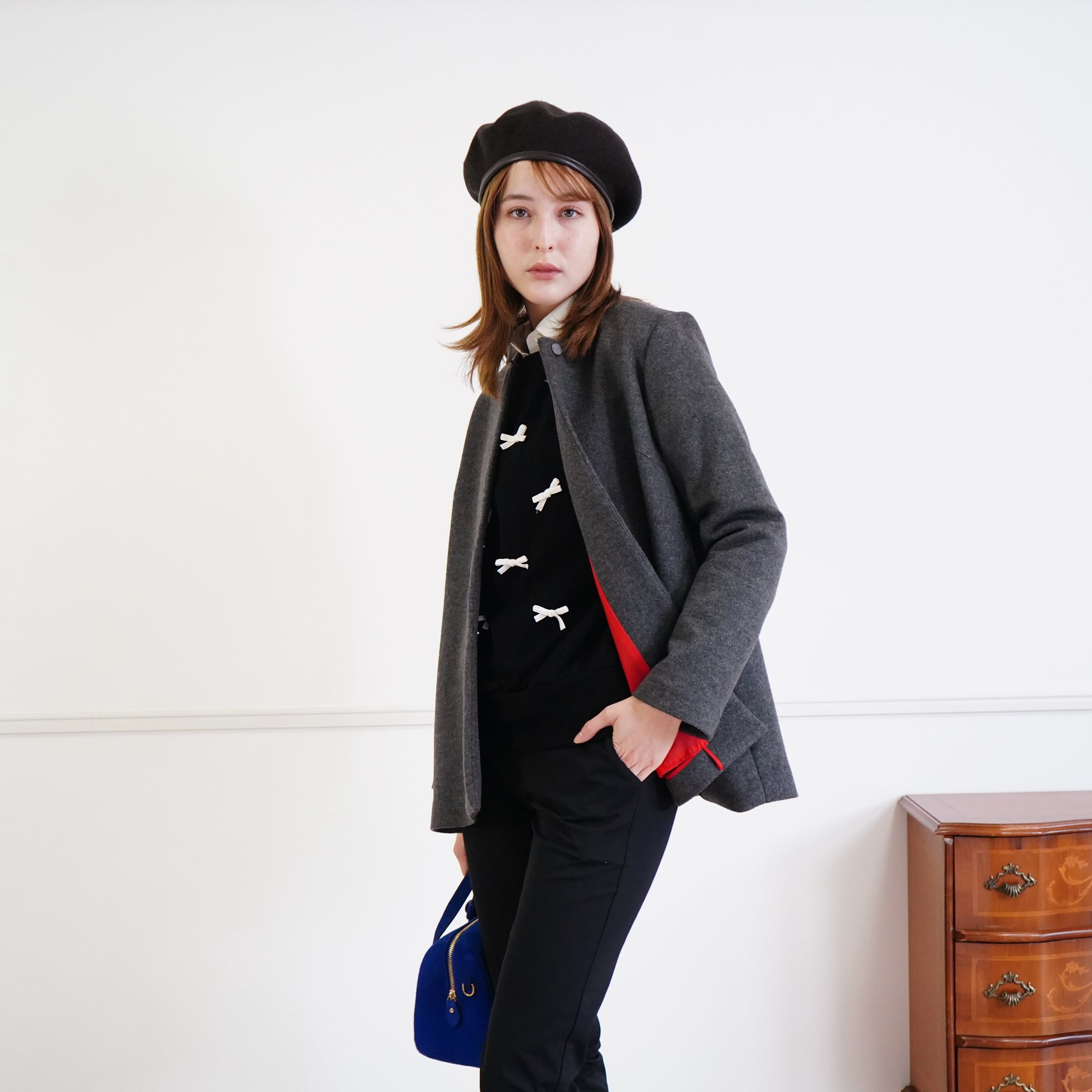 着用時は品のあるグレー、室内で脱いだときにはアクセントの効いたコートになります。