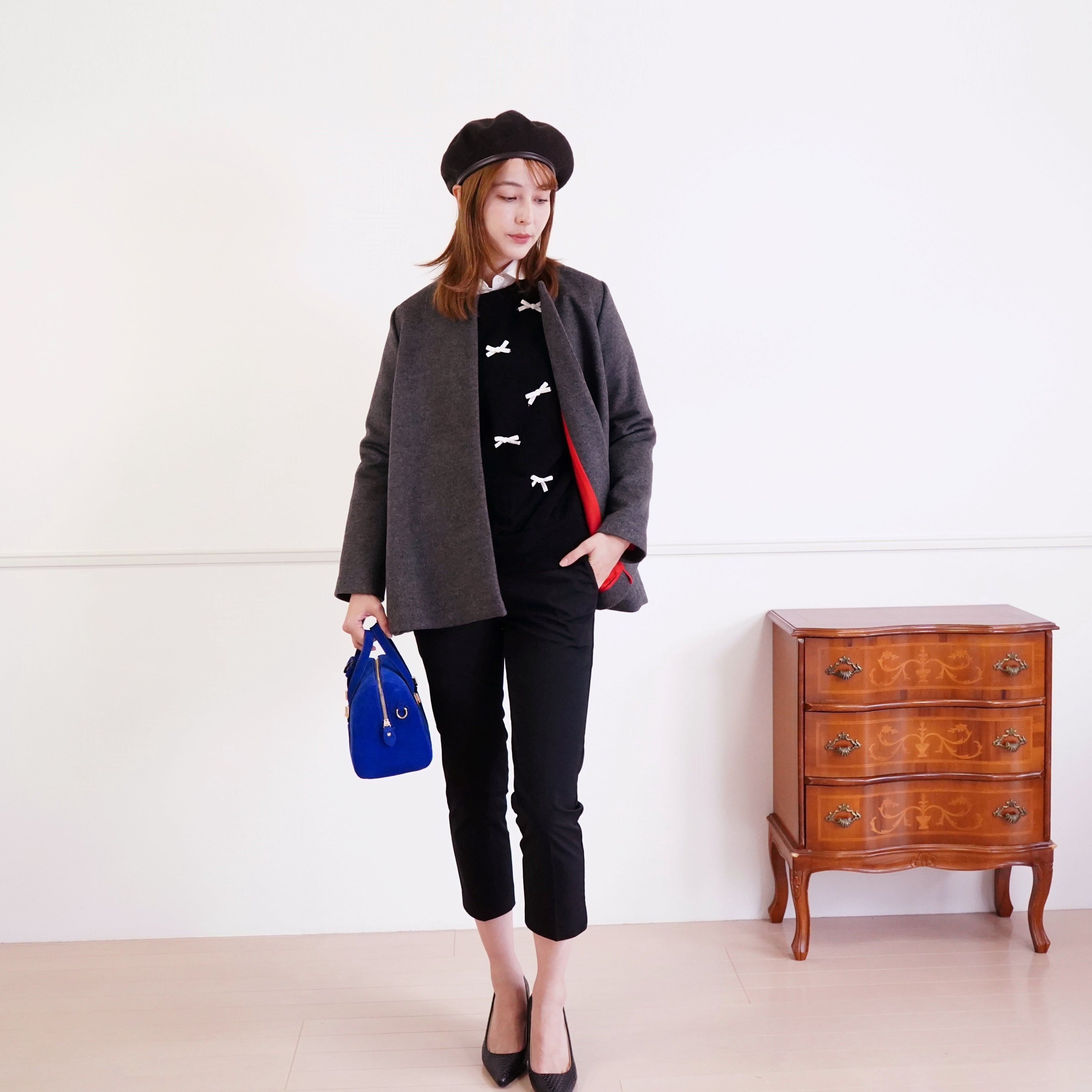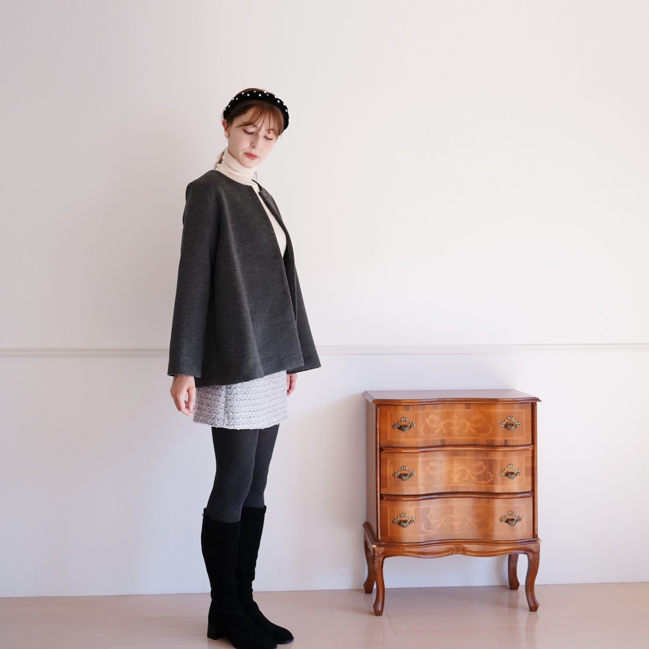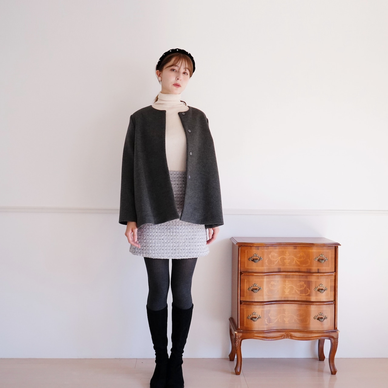 ショートコートはスカート、パンツどちらにも合わせやすく、
