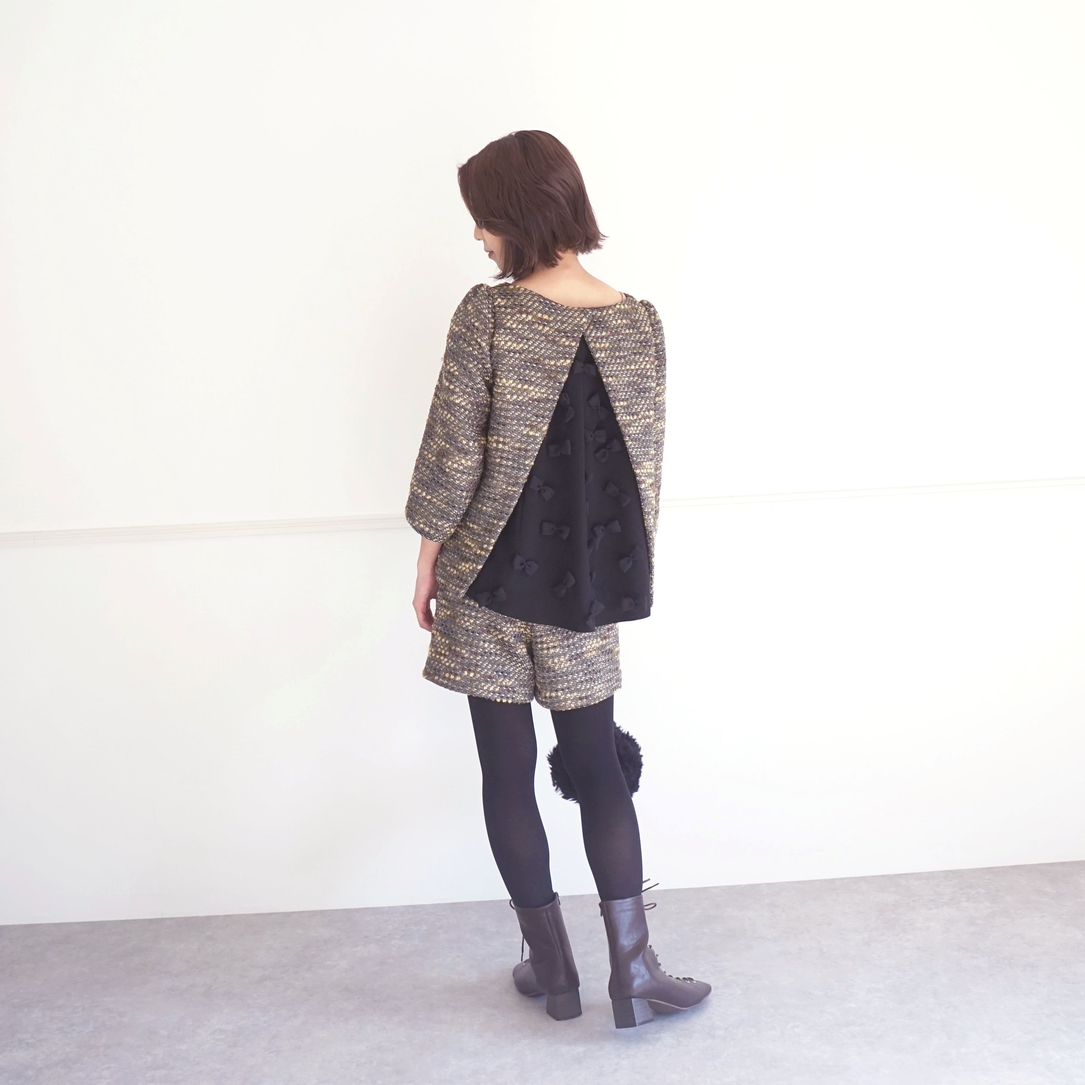 後ろ沢山リボンのリントンツイードブラウス(ベージュ系)