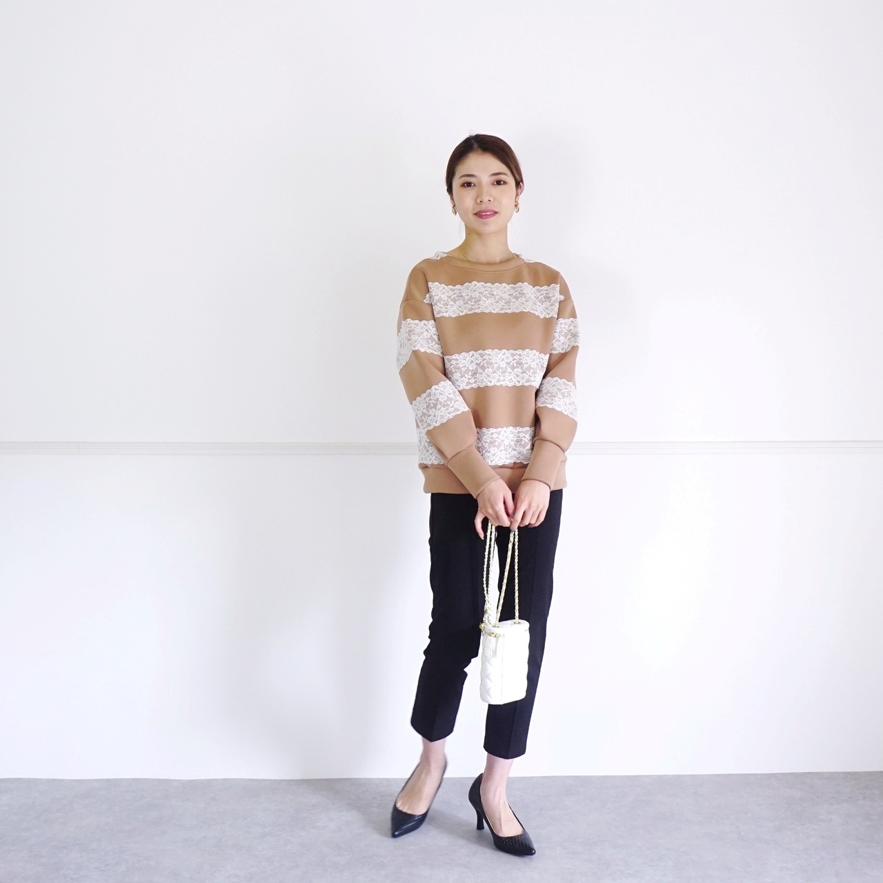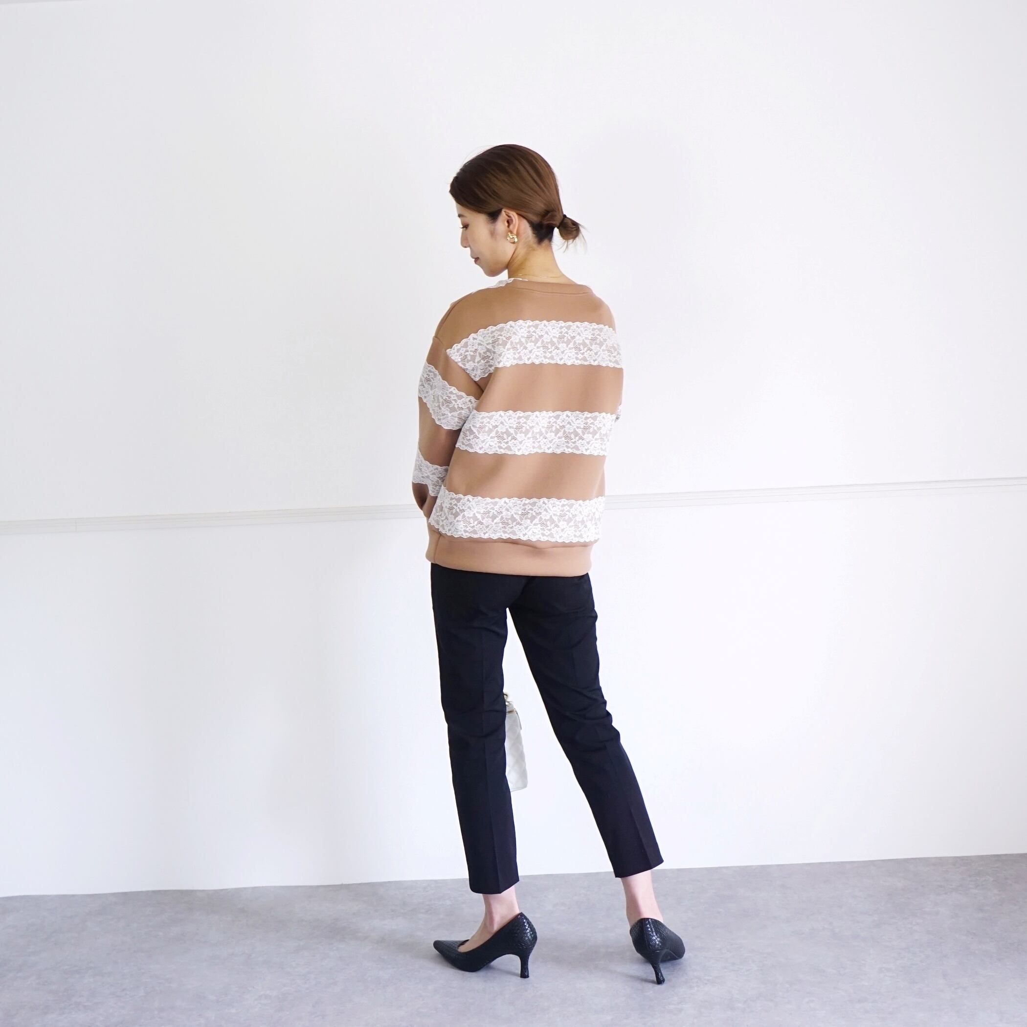 Lace Pullover レースボーダーダンボールニットプルオーバー(モカブラウン)38