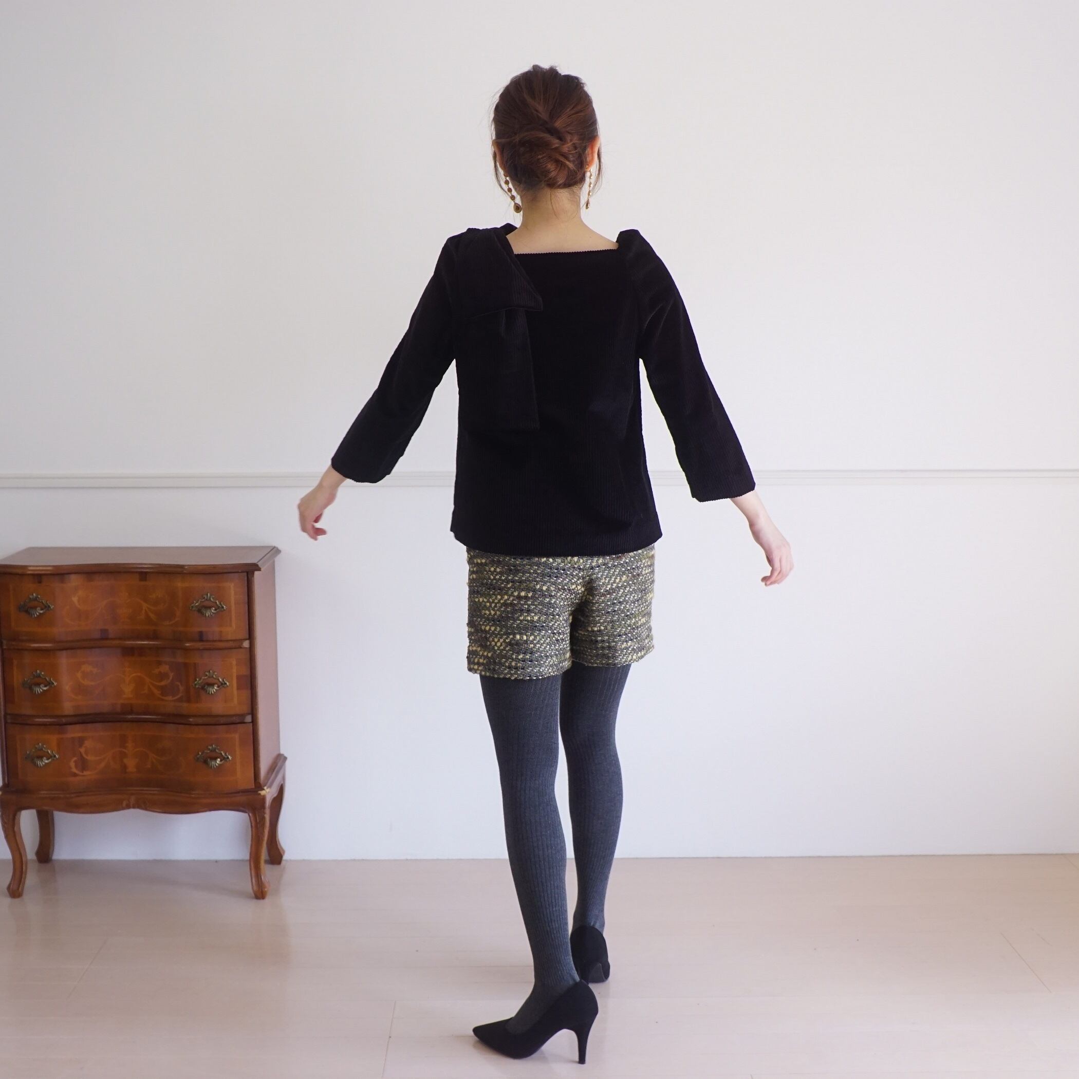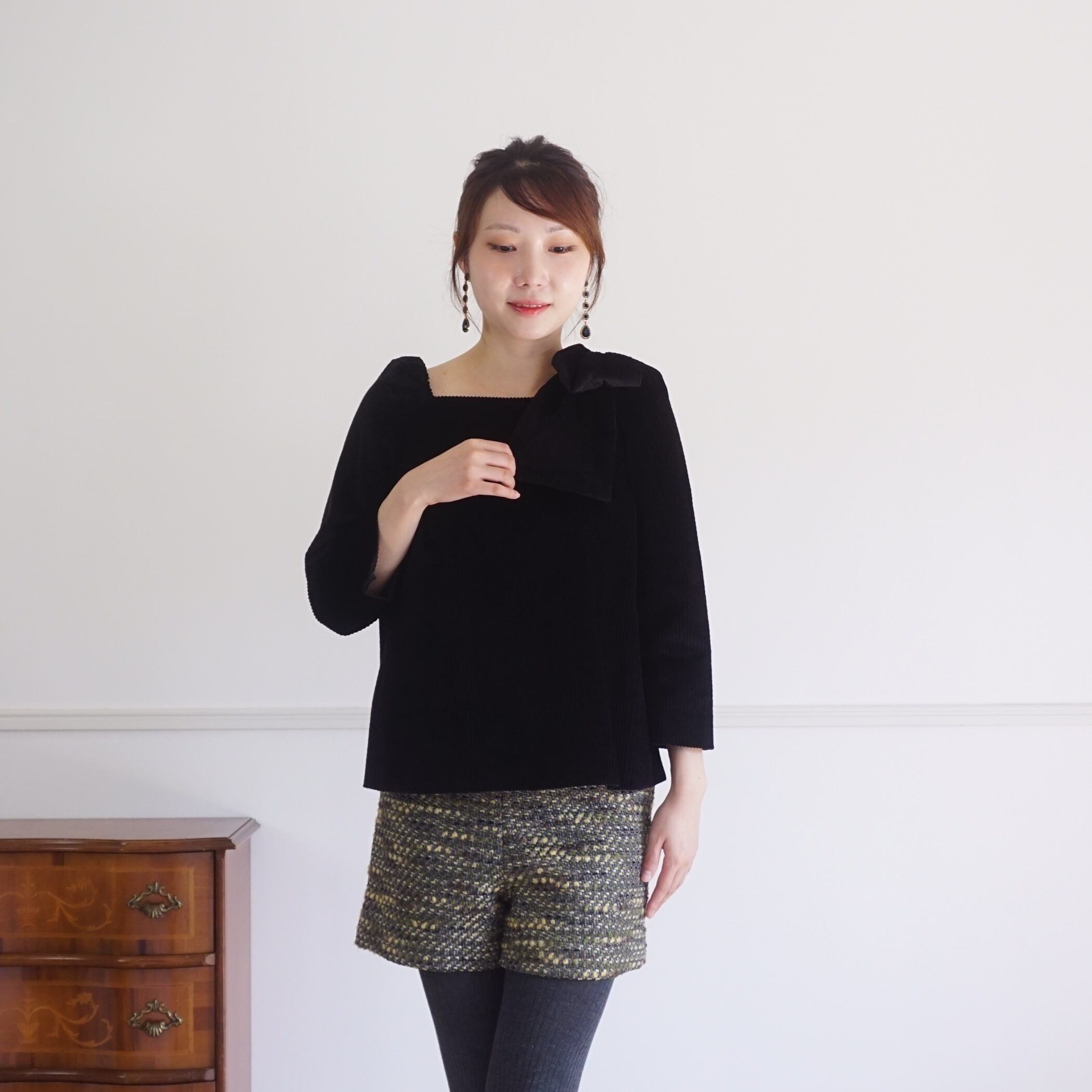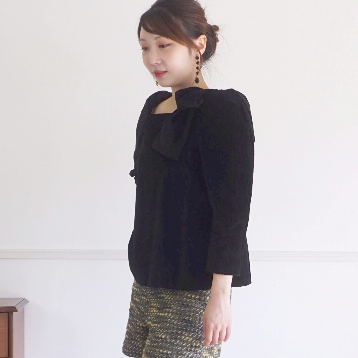 リボン付きコーデュロイスクエアネックブラウス(ブラック)38