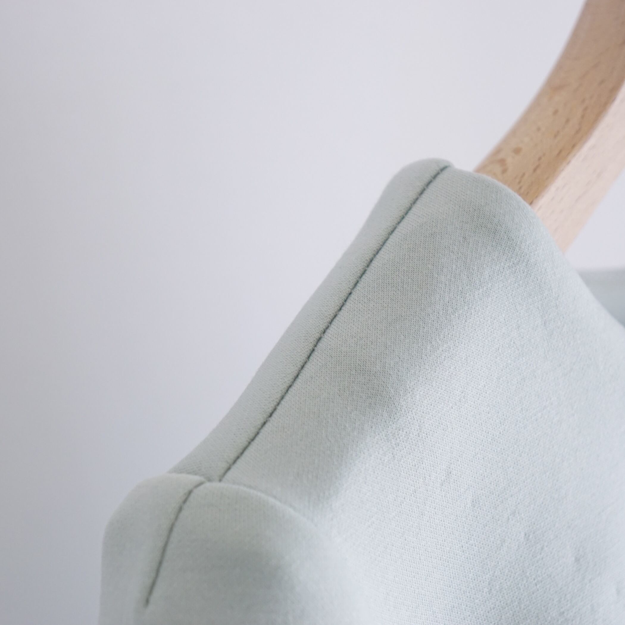 胸元のダーツや肩先のダーツ等で立体的なフォルムにしました。
